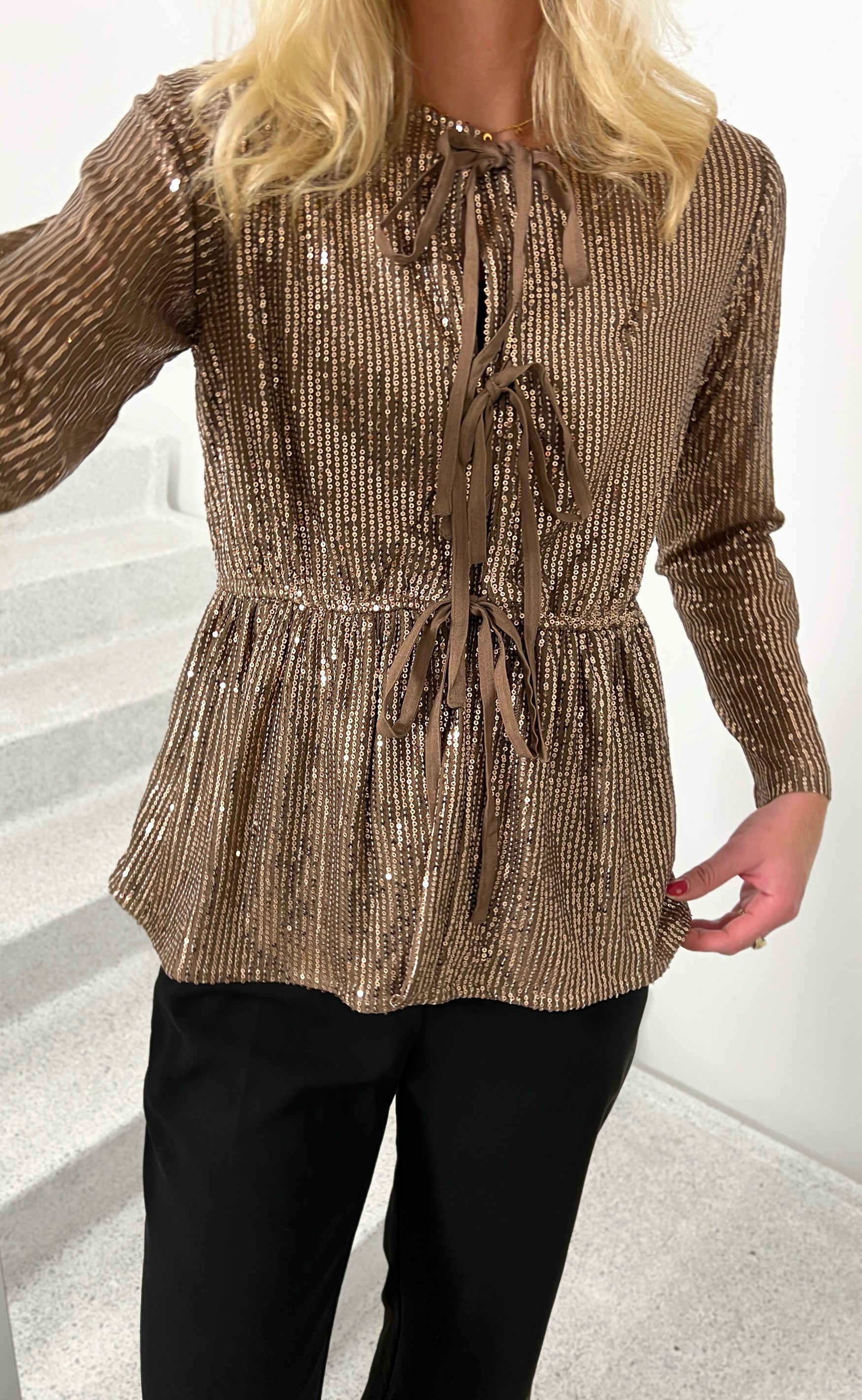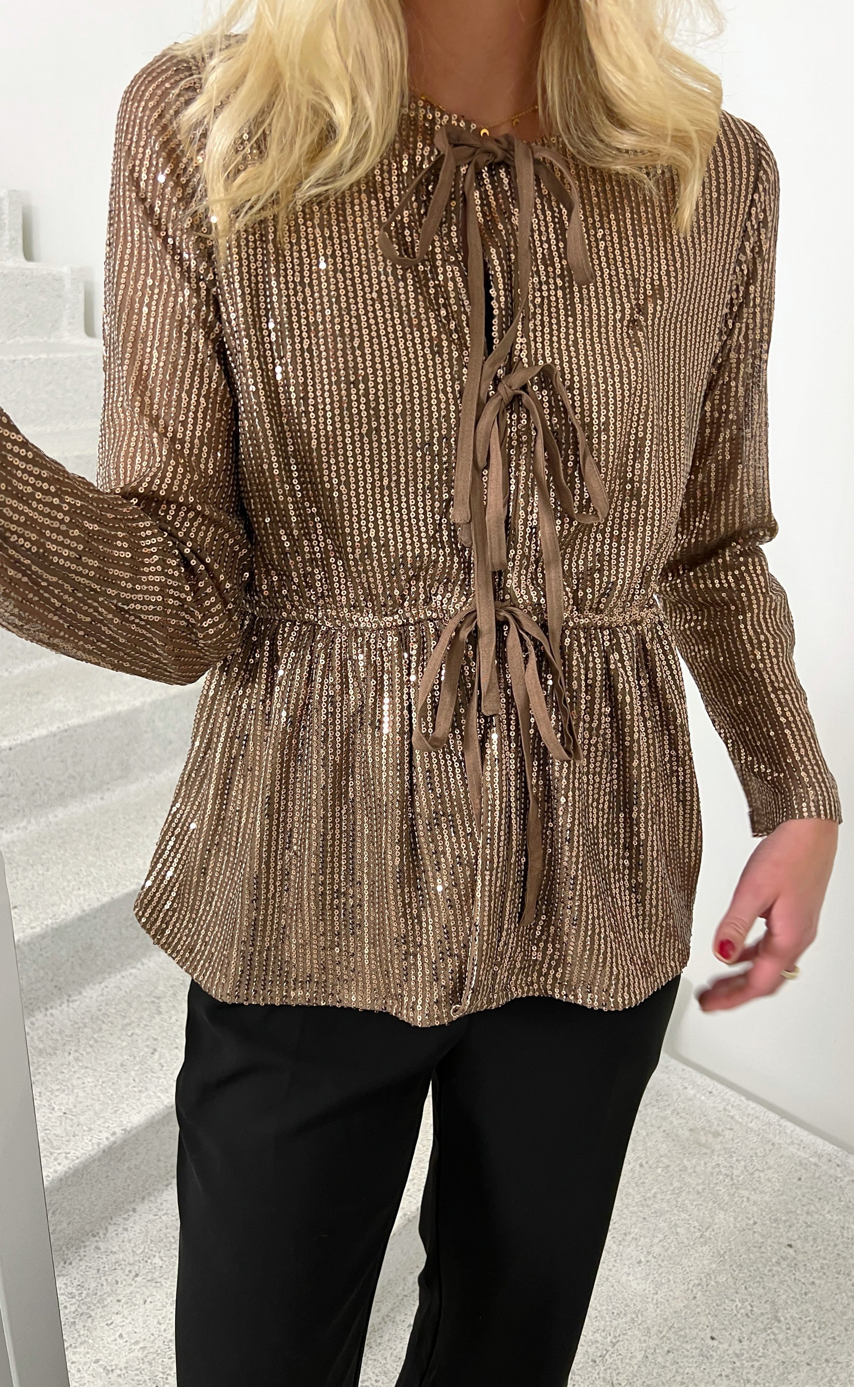 Smuk binde-bluse fra INA Copenhagen med brune palietter.