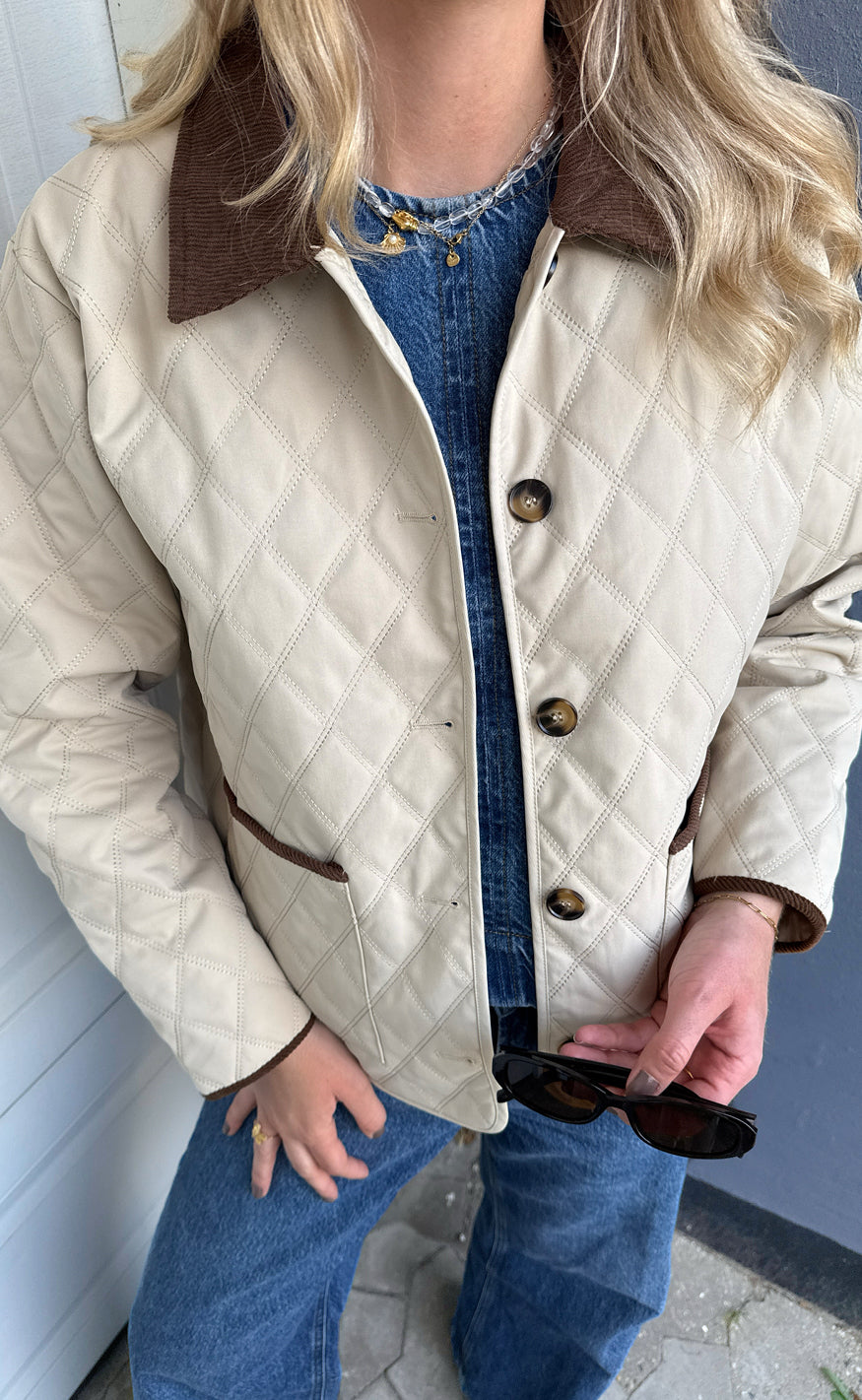Smart jakke fra Say INA Copenhagen i beige quilt med brune fløjs-detaljer ved håndled, lommerne og kraven.