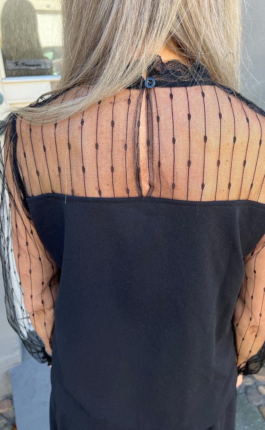 Buksedragten har den fineste overdel med blonde-ærmer og blonde ved halsen. Buksedragten har elastik bagtil i buksekanten og kan åbnes i nakken med en knap.