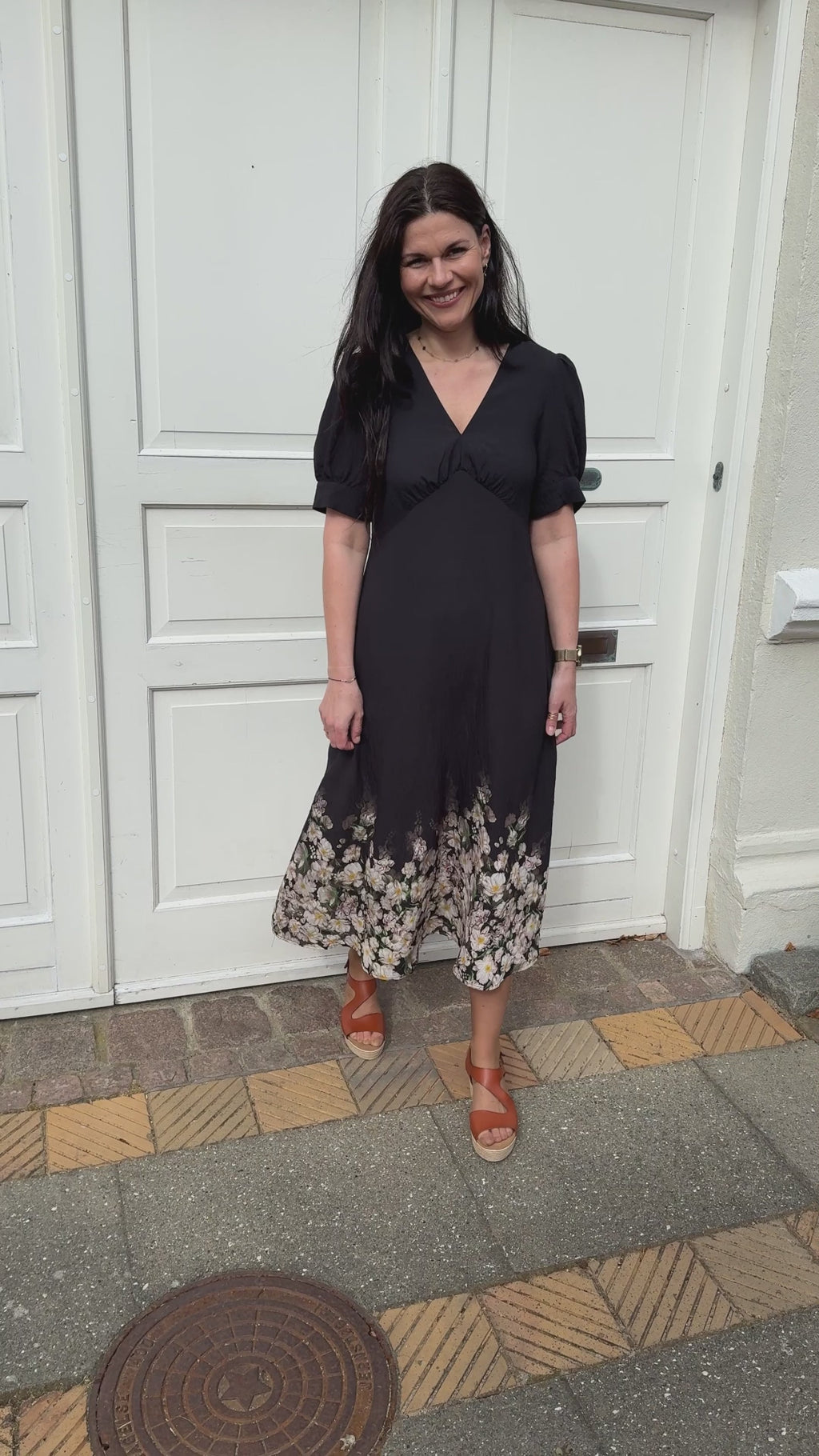 Smuk kjole fra INA Copenhagen i sort med det fineste blomsterprint nederst på kjolen.