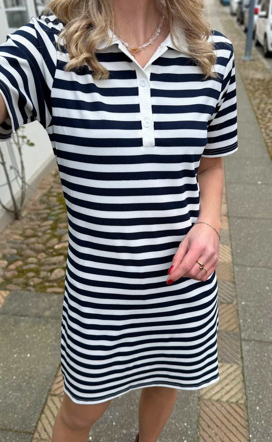 Smart polo kjole fra INA Copenhagen med striber i navy og off white.