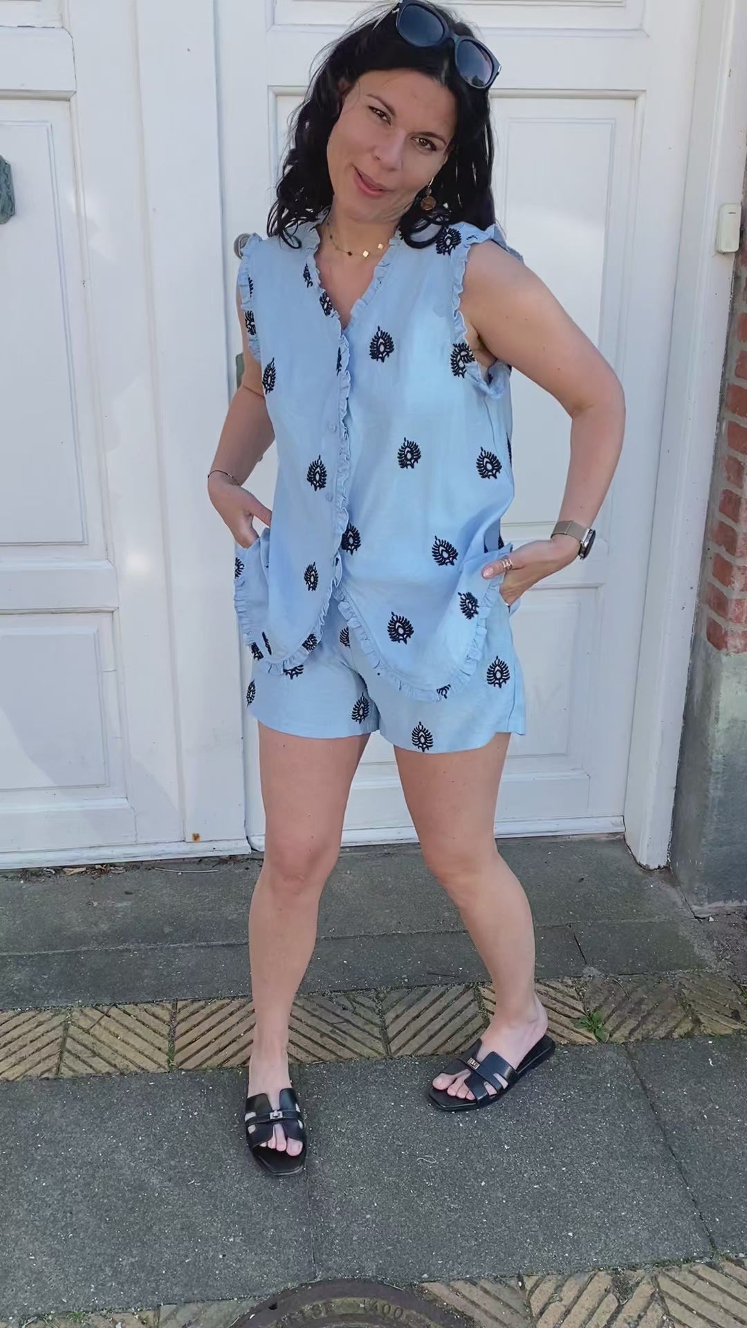 Say INA Copenhagen shortsene er perfekte at style med matchende Say INA Copenhagen Top - Melania - Blue w. Black Embroidery.
