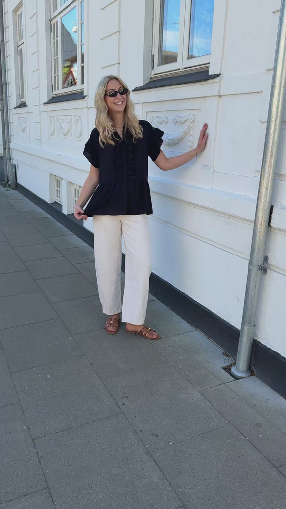 Toppen har et oversize fit, flæse-ærmer og en åbning fortil med flæser omkring.