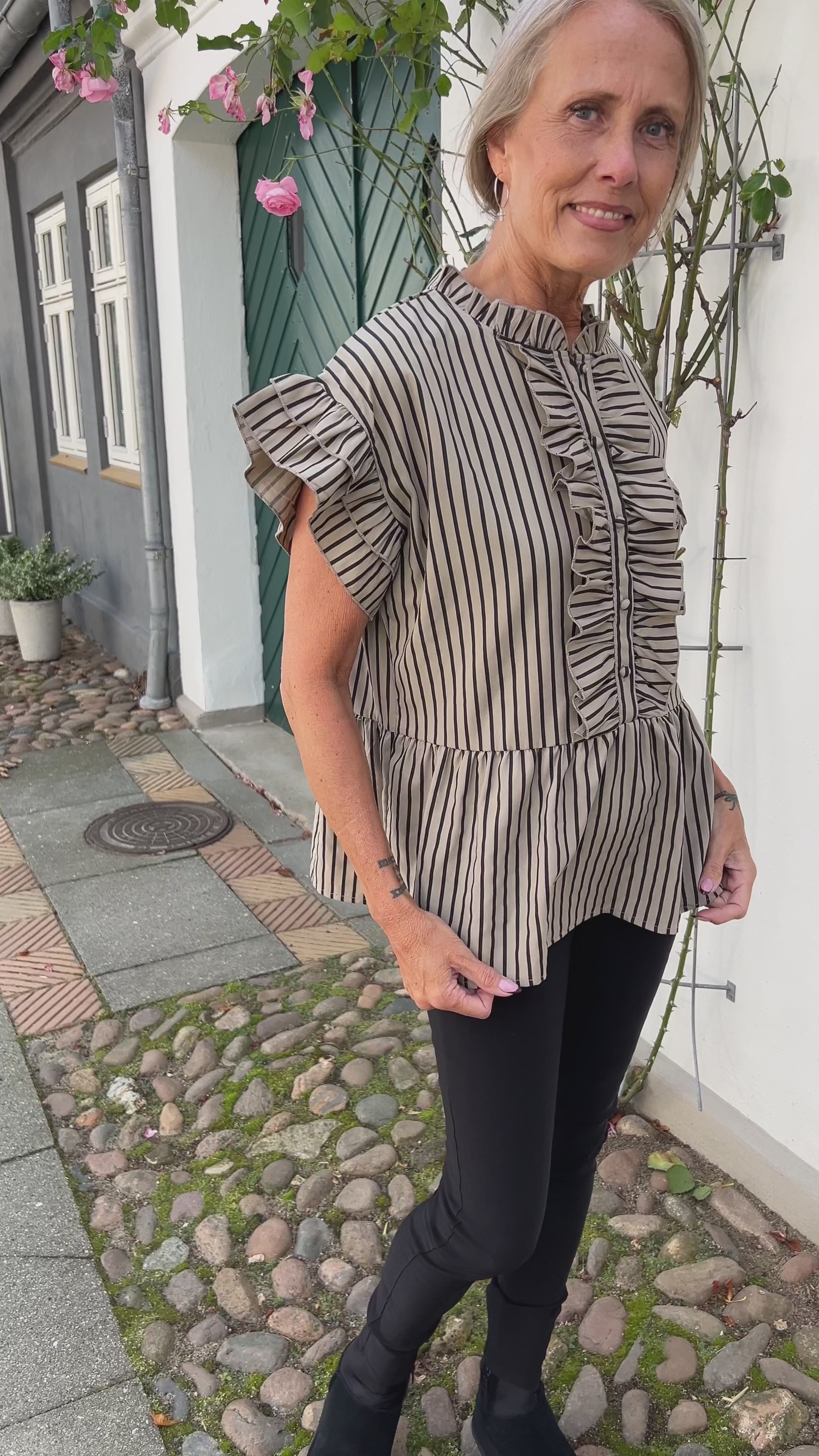 Toppen har et oversize fit, flæse-ærmer og en åbning fortil med flæser omkring.