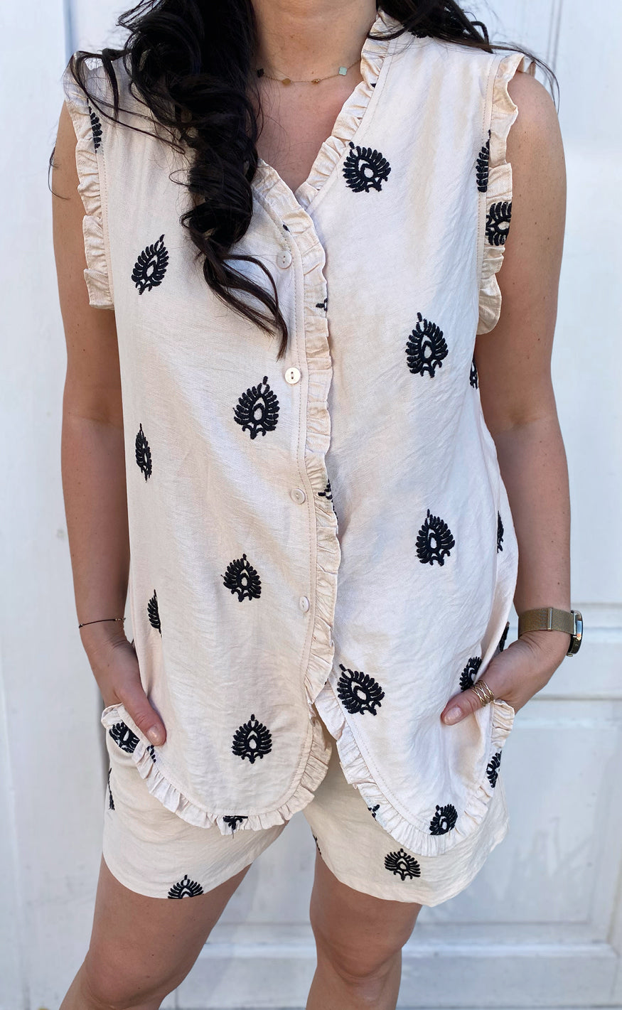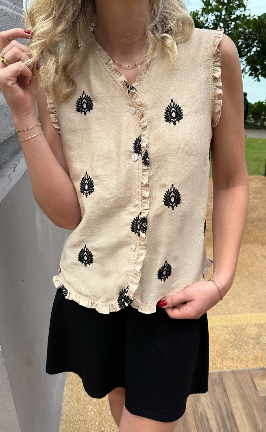 Den smukkeste top fra INA Copenhagen, i beige med sorte broderi detaljer.