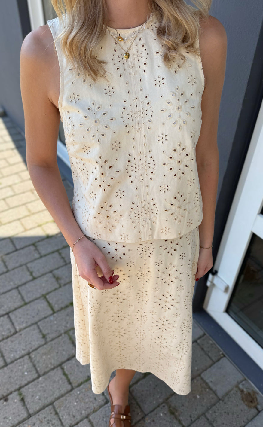 Flot denim top fra INA Copenhagen i off white med det fineste broderi mønster