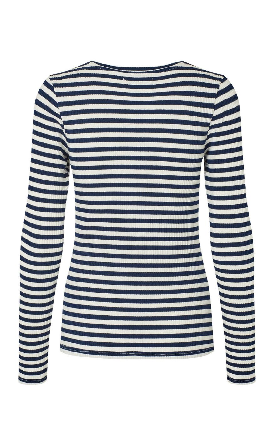 Klassisk ribstrikket bluse fra Lollys Laundry med smalle striber i navy og offwhite. Blusen har en tætsiddende pasform, rund hals og lange ærmer, som giver et enkelt og tidløst udtryk.