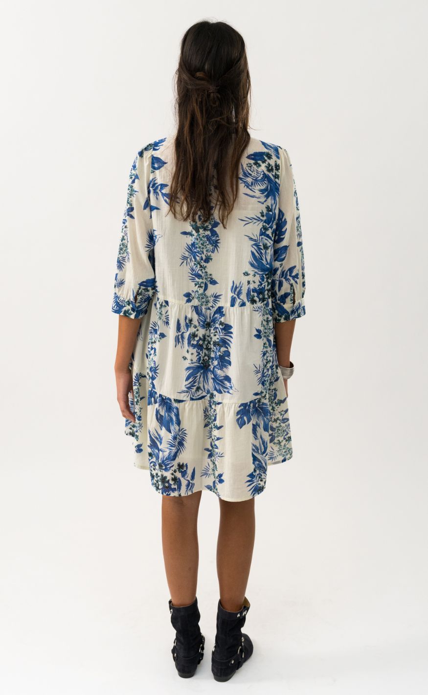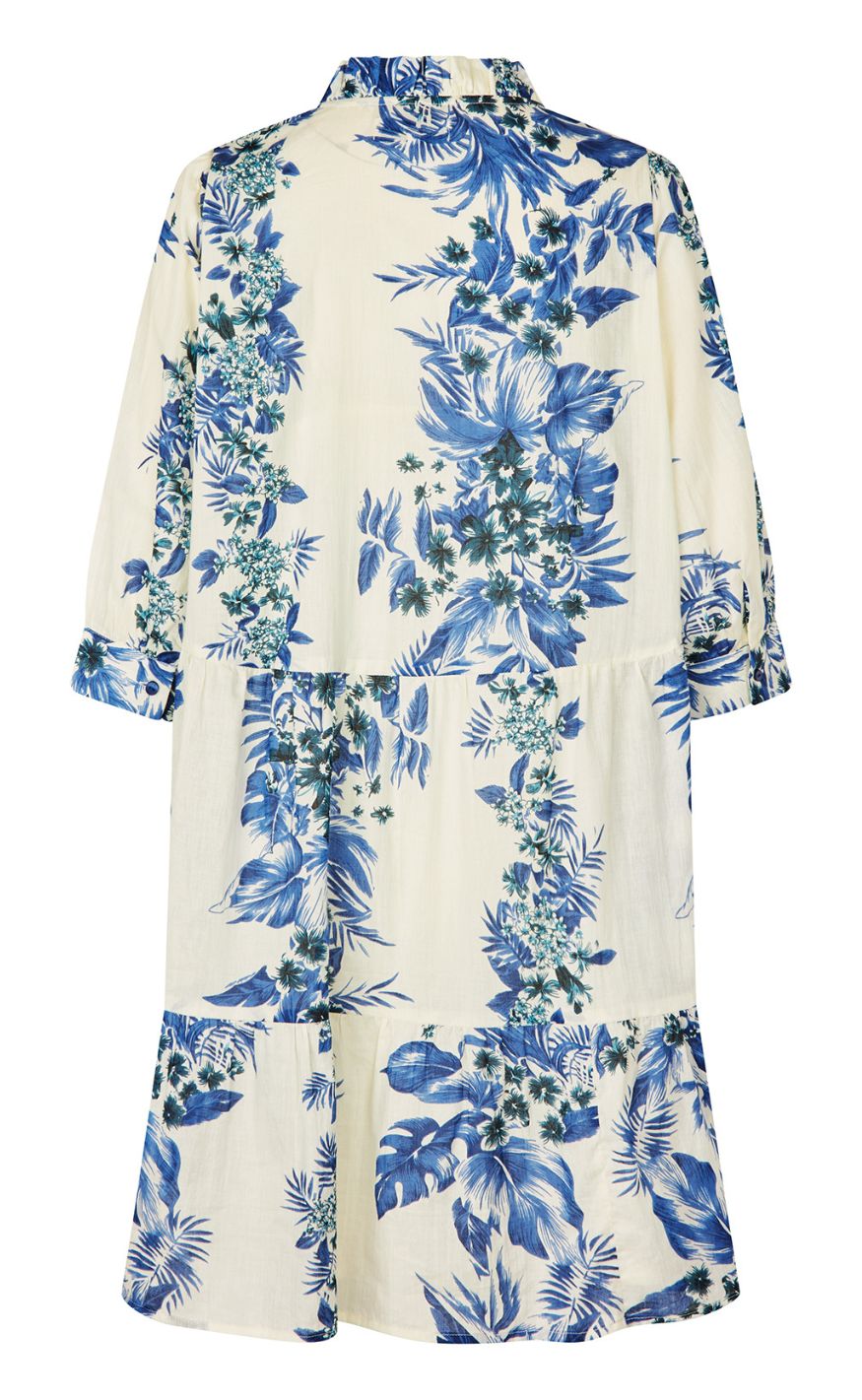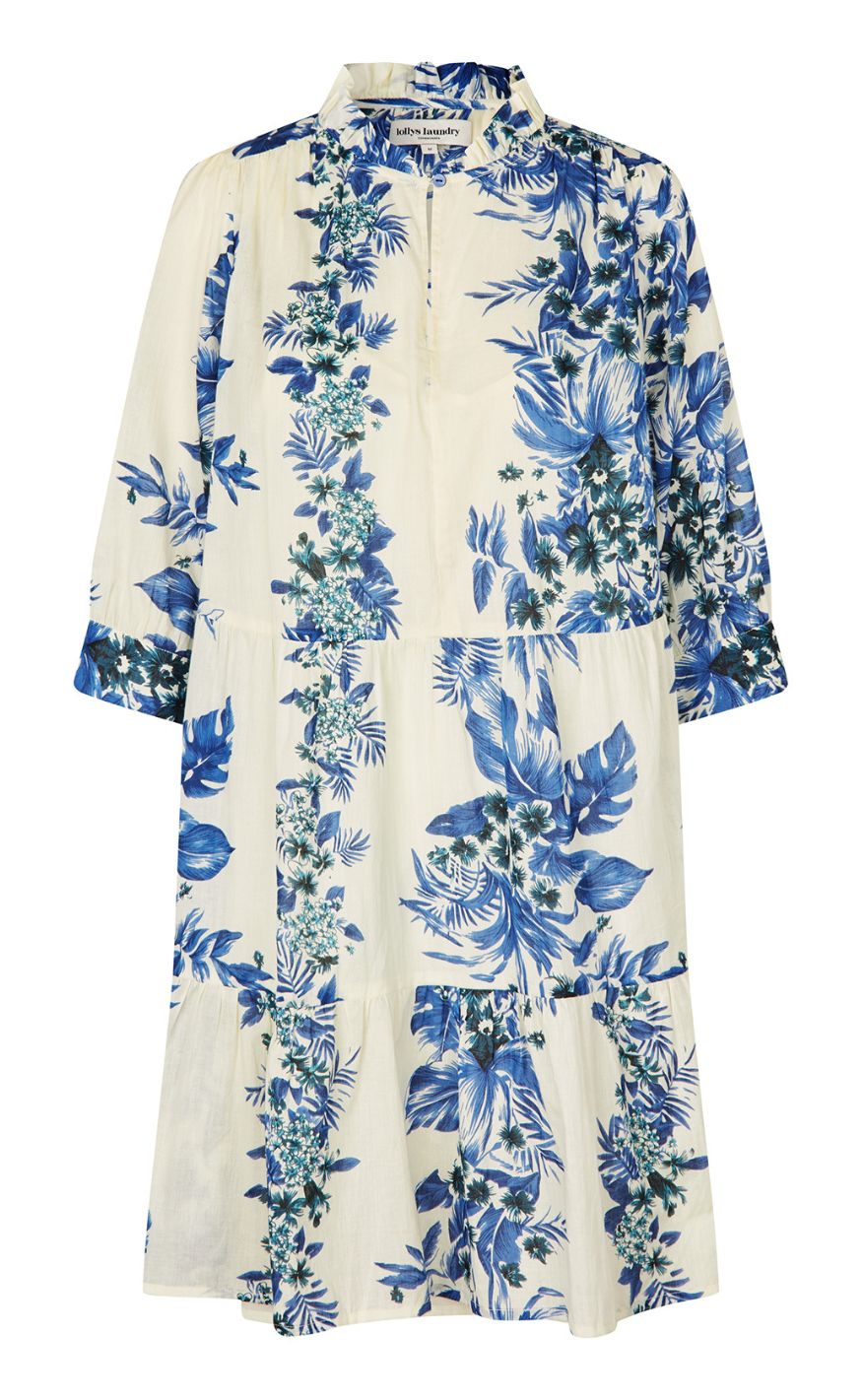 Let og feminin kjole fra Lollys Laundry med et smukt blåt blomsterprint på en lys bund. Kjolen har en løs og behagelig pasform med rund hals, lille V-udskæring og korte ærmer.
