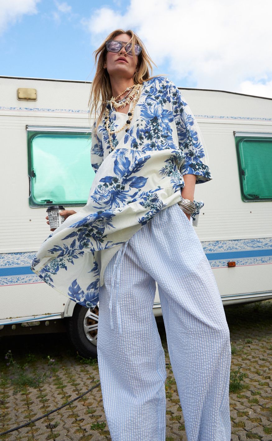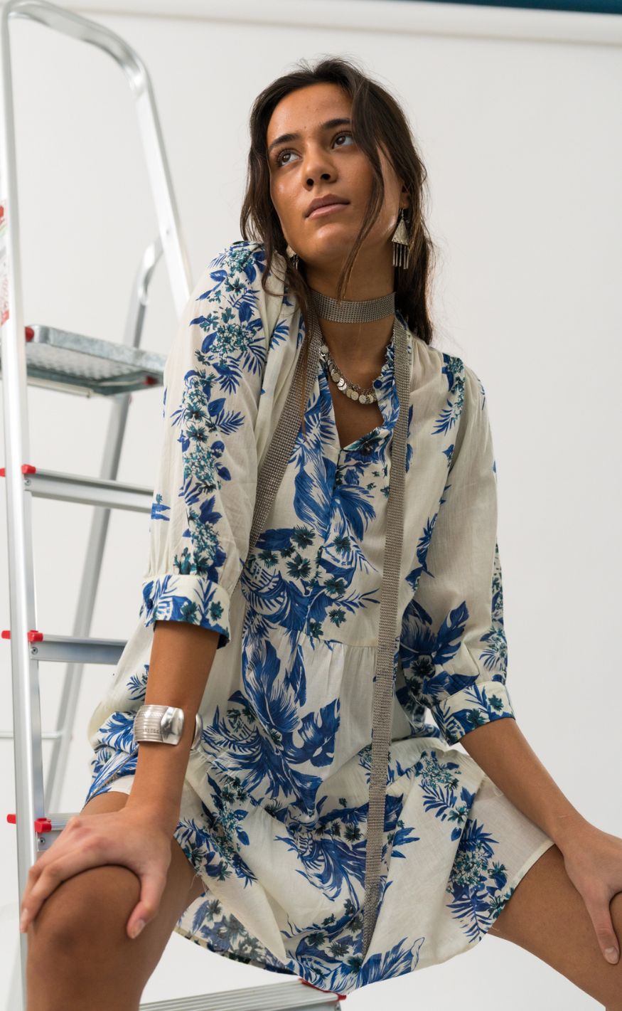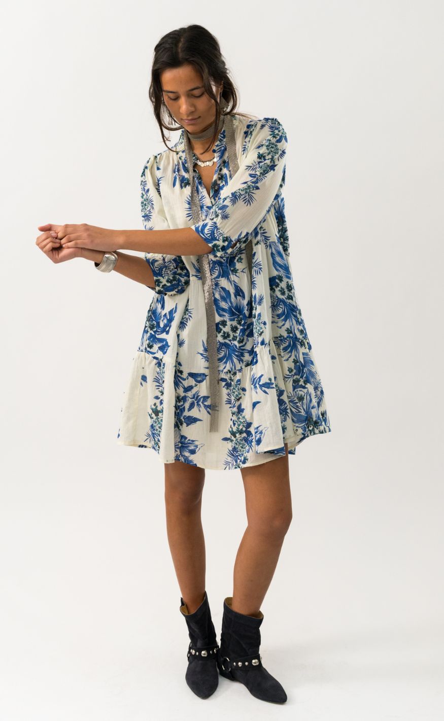 Let og feminin kjole fra Lollys Laundry med et smukt blåt blomsterprint på en lys bund. Kjolen har en løs og behagelig pasform med rund hals, lille V-udskæring og korte ærmer.