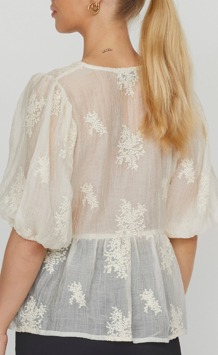 Blusen er let gennemsigtig og har en peplum effekt.