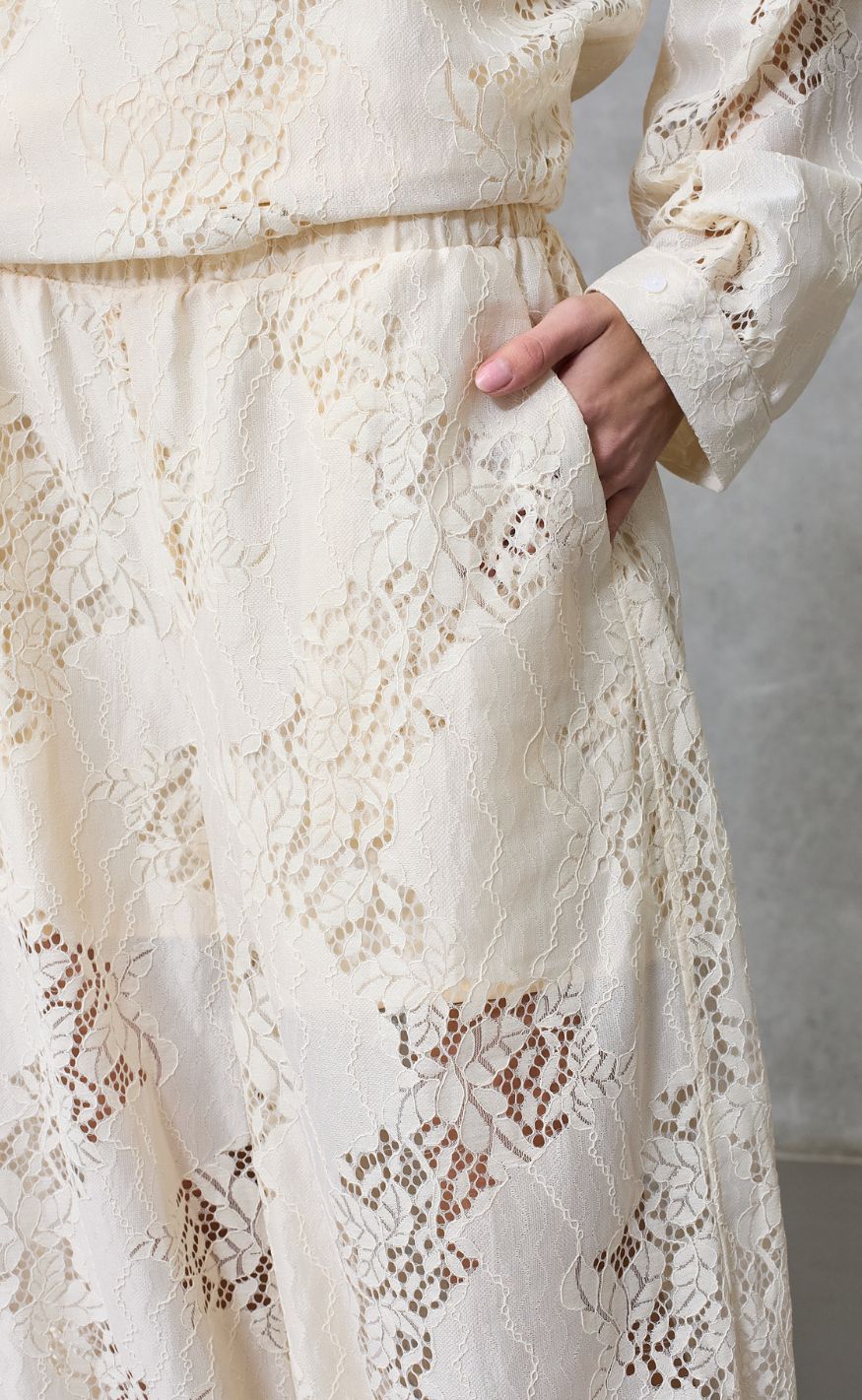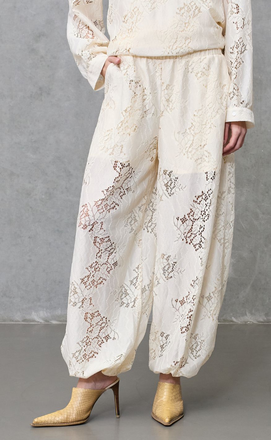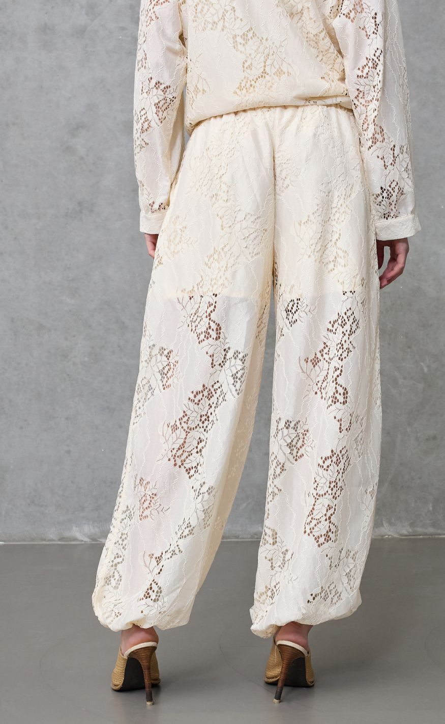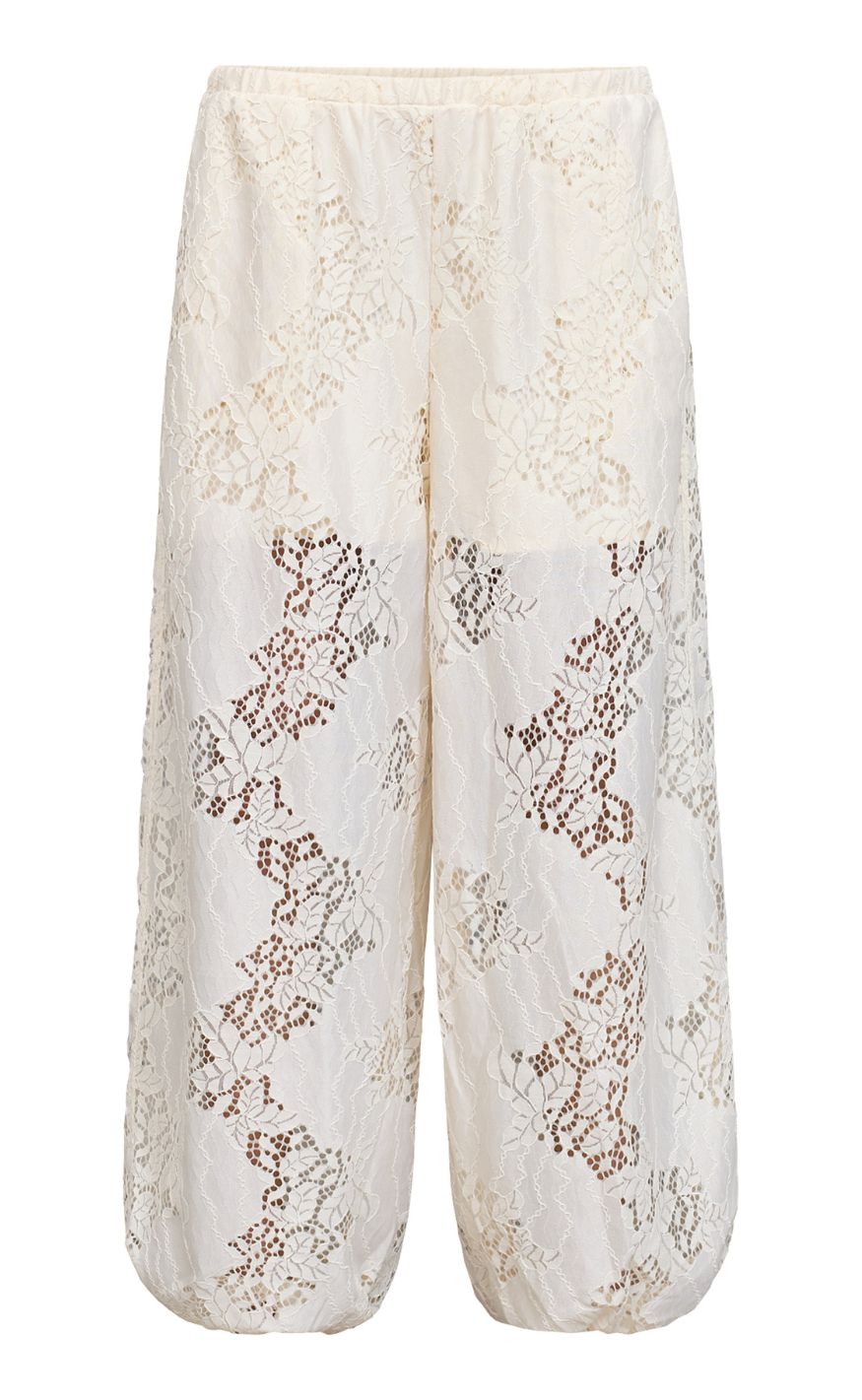 Bukser i offwhite med gennemgående blondemønster og en let, luftig pasform.