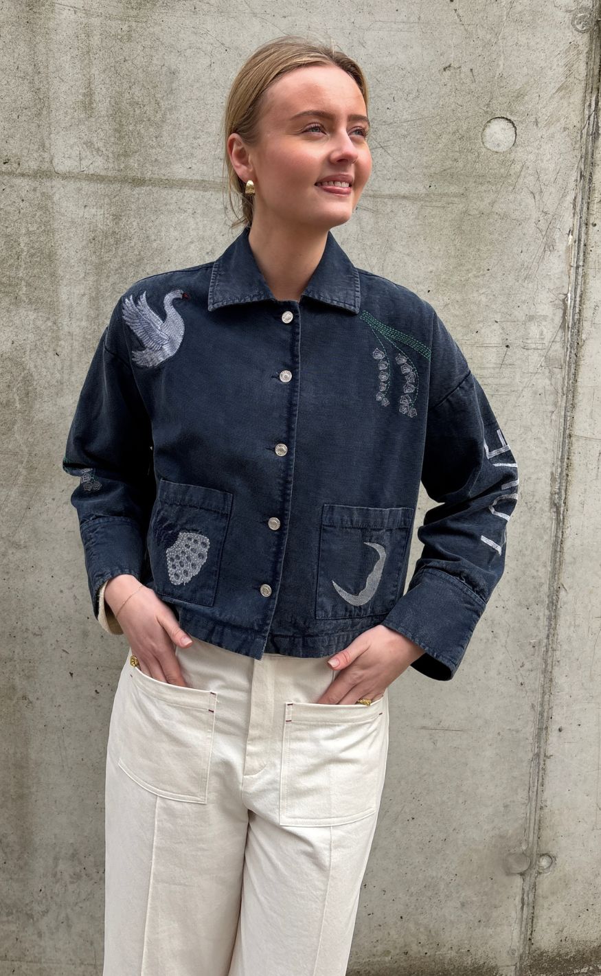 Jakke med fine broderede detaljer, der giver et unikt og dekorativt udtryk.