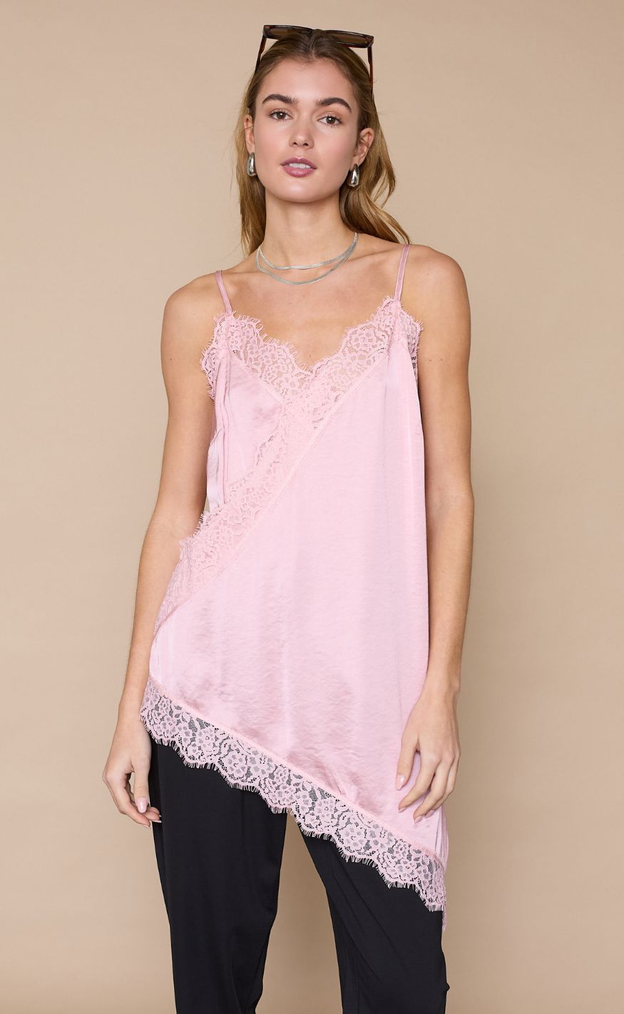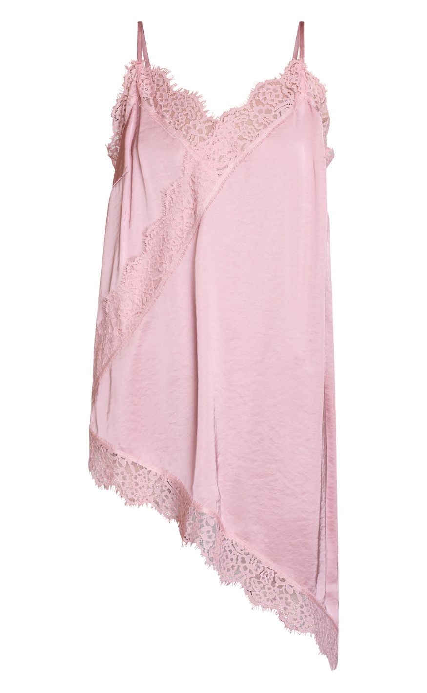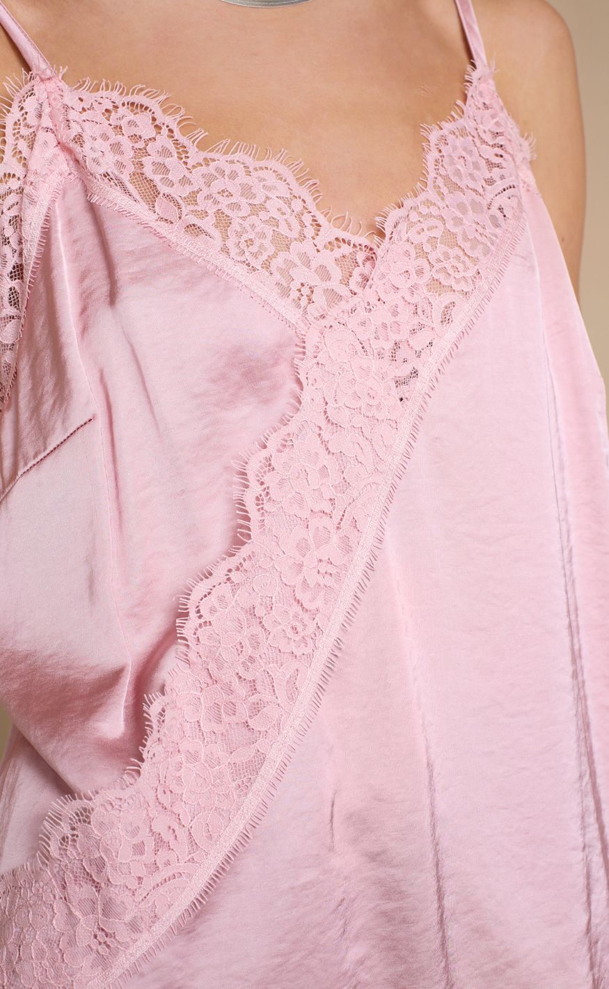 Let og feminin top i lyserød med fine blondedetaljer og smalle stropper.