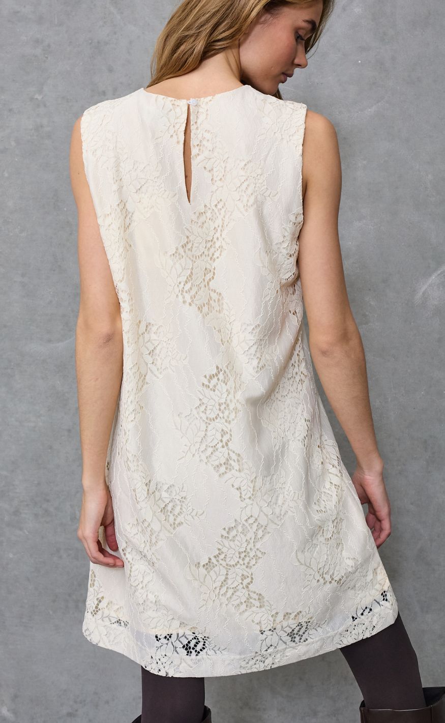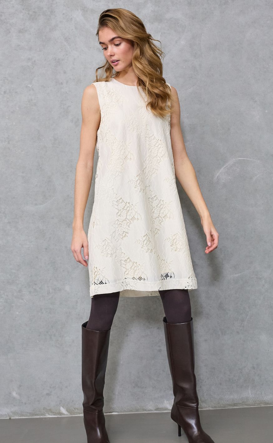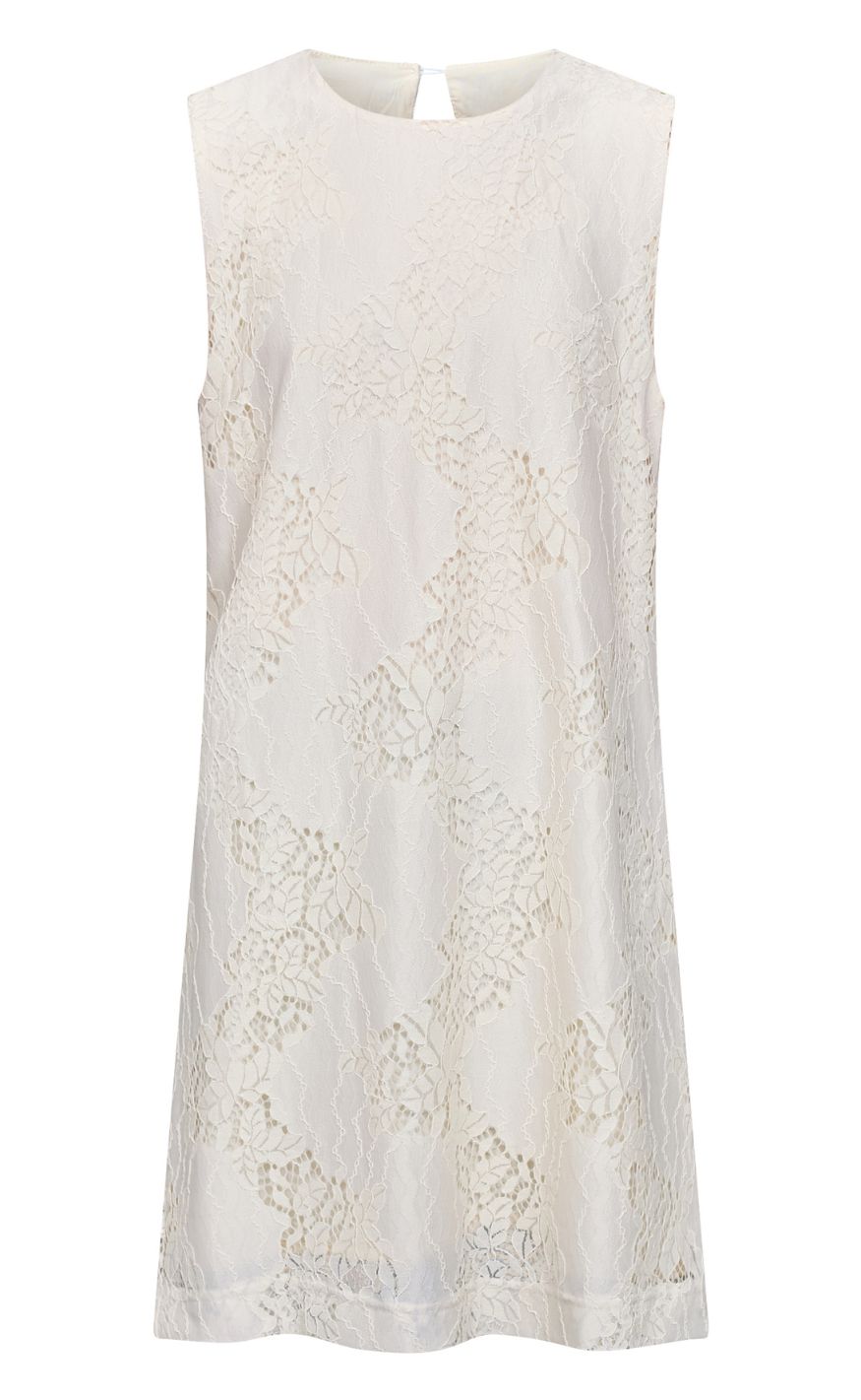 Ærmeløs kjole i offwhite med et fint blondemønster og en let, løs pasform. Den runde hals og den knælange længde giver et enkelt og elegant udtryk, der gør kjolen nem at style til både hverdag og pænere brug.