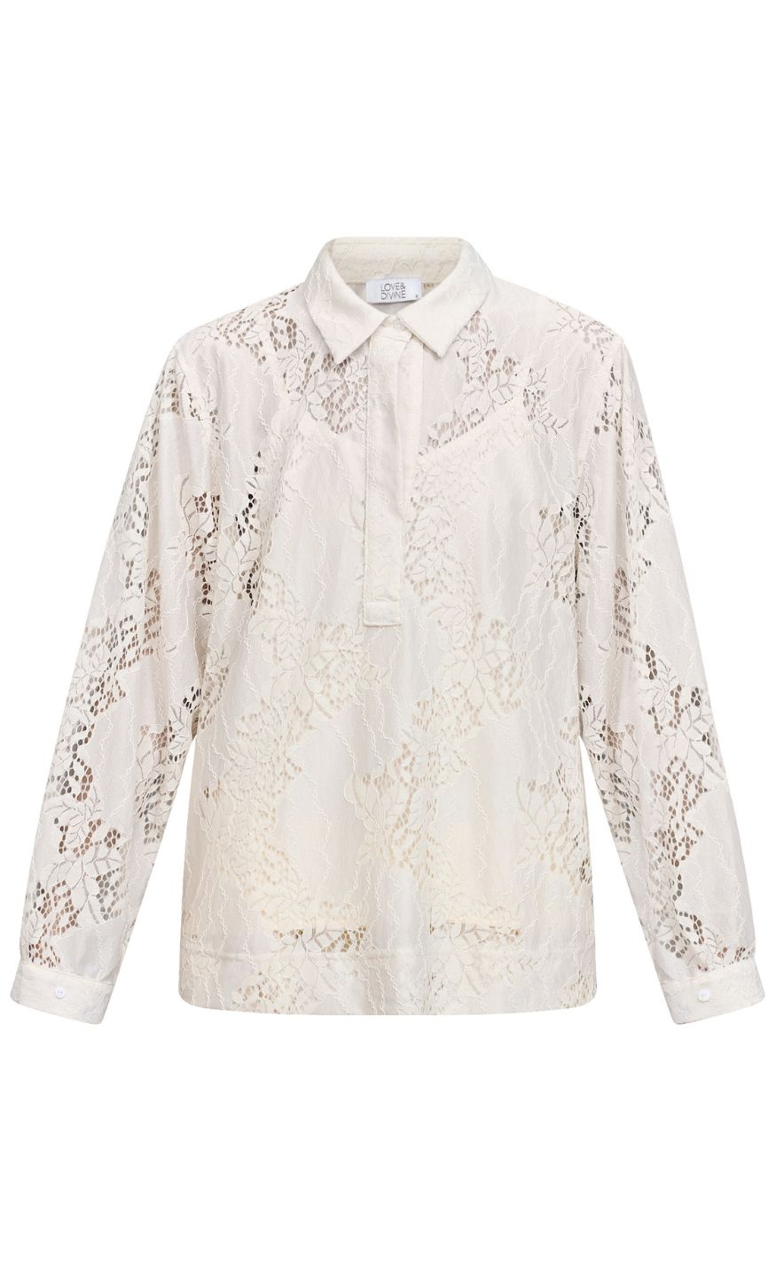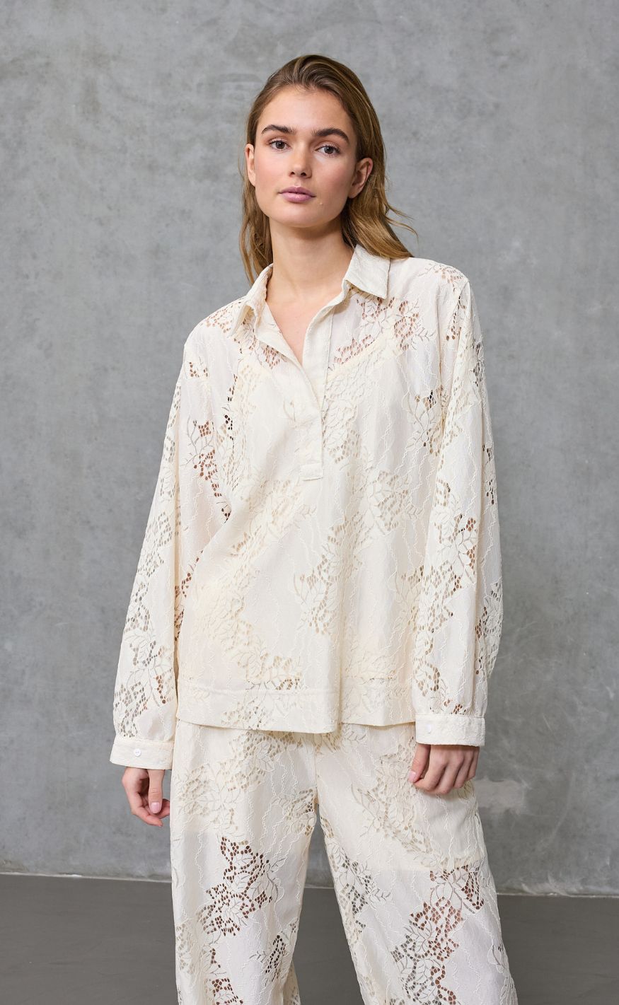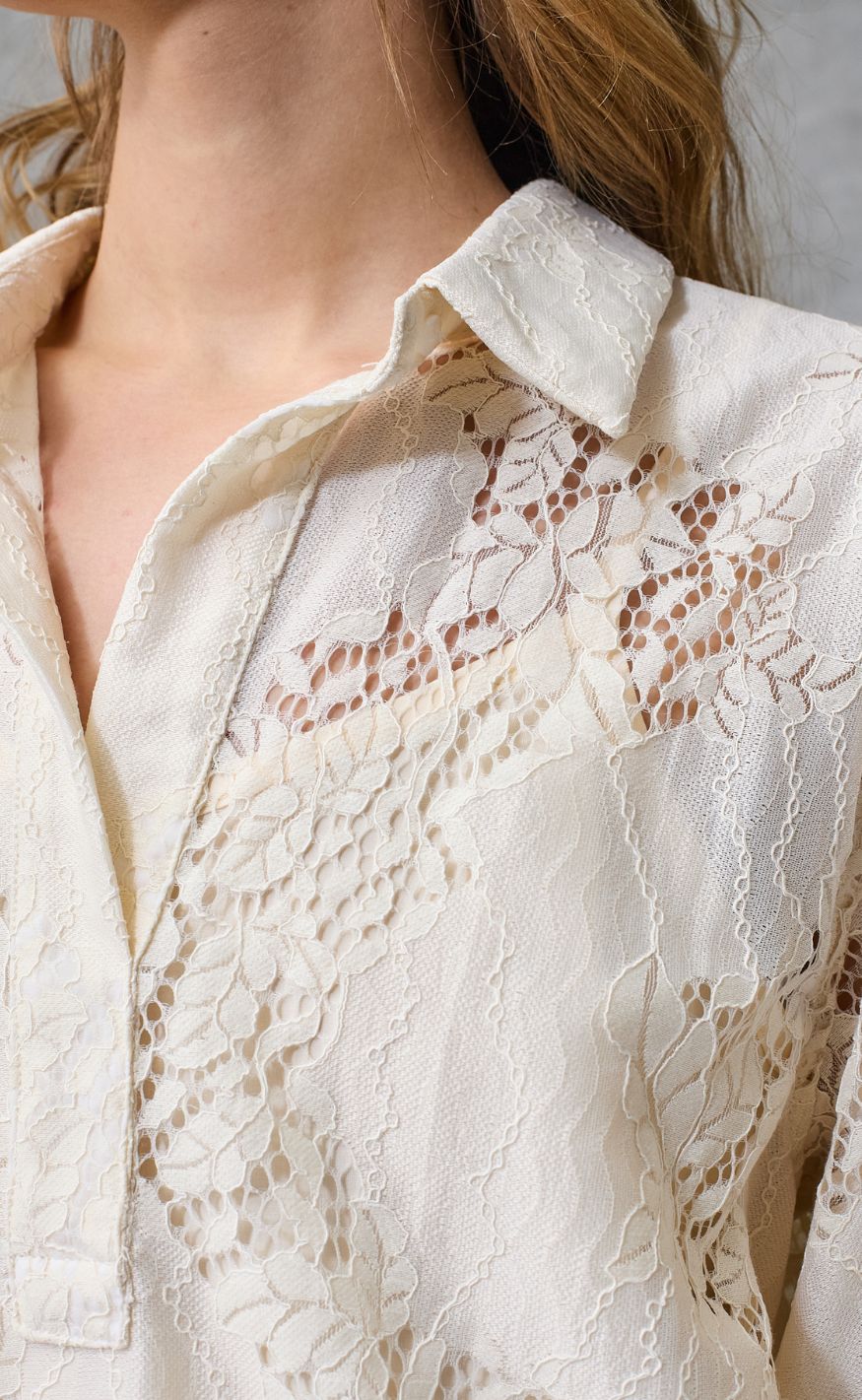 Det fine blondemønster giver et let og feminint udtryk, mens den enkle pasform gør skjorten nem at style til både hverdag og mere formelle anledninger.