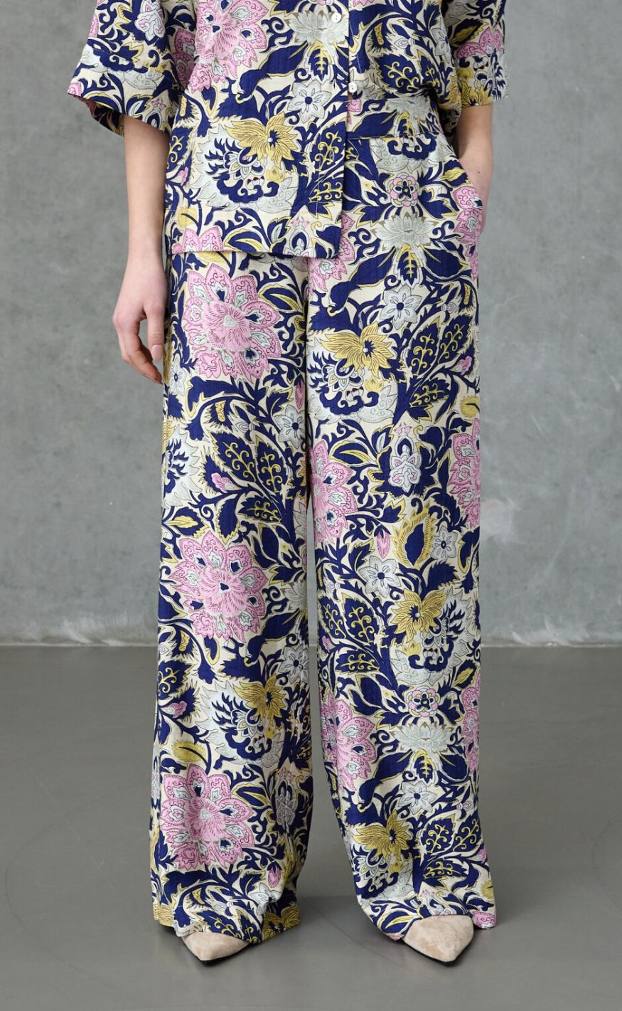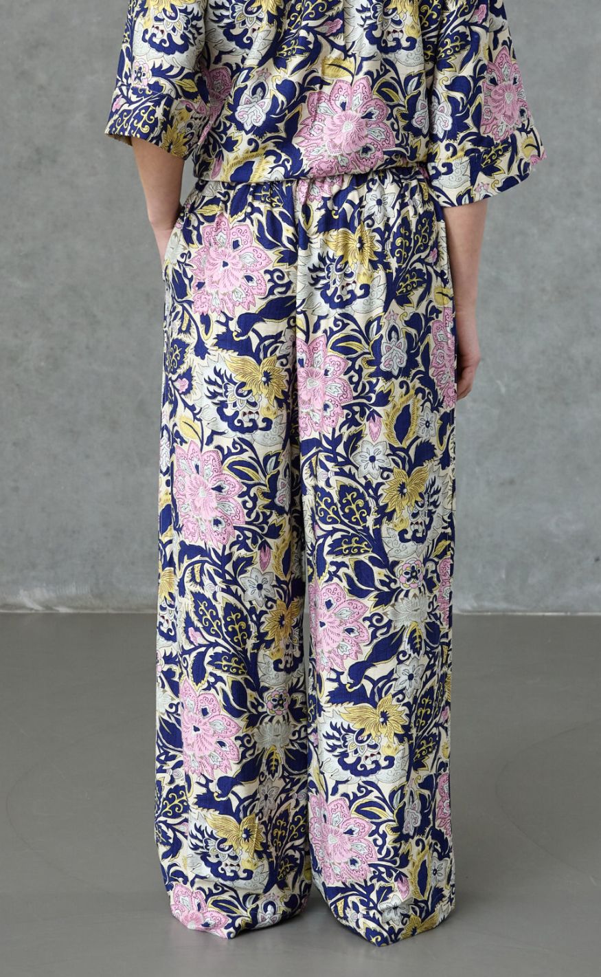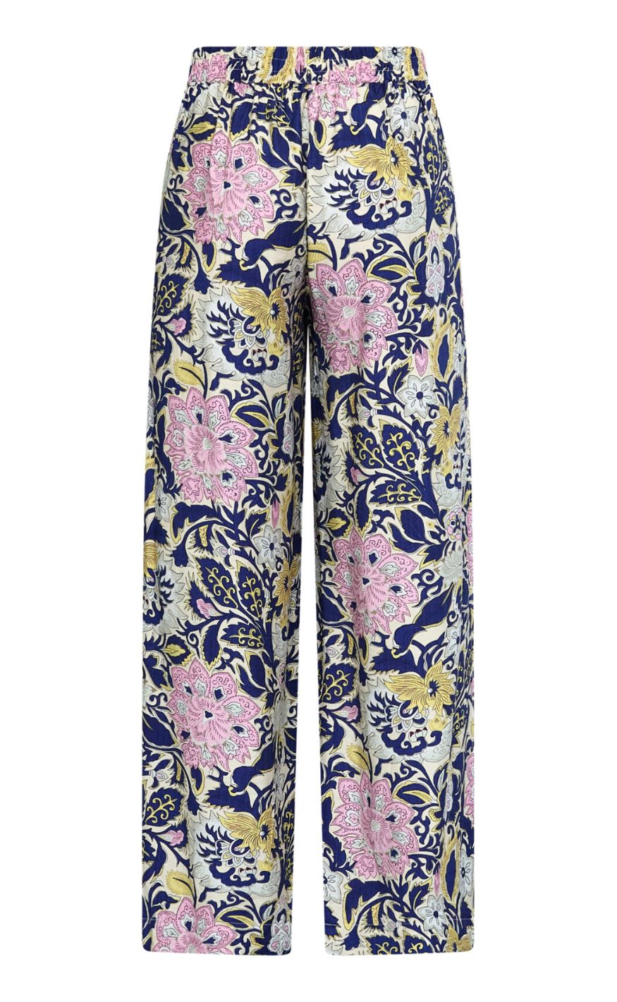 Elegante bukser med vidde og et smukt, farverigt allover-print. Modellen har løs pasform og falder flot, hvilket giver et afslappet men stilfuldt udtryk.