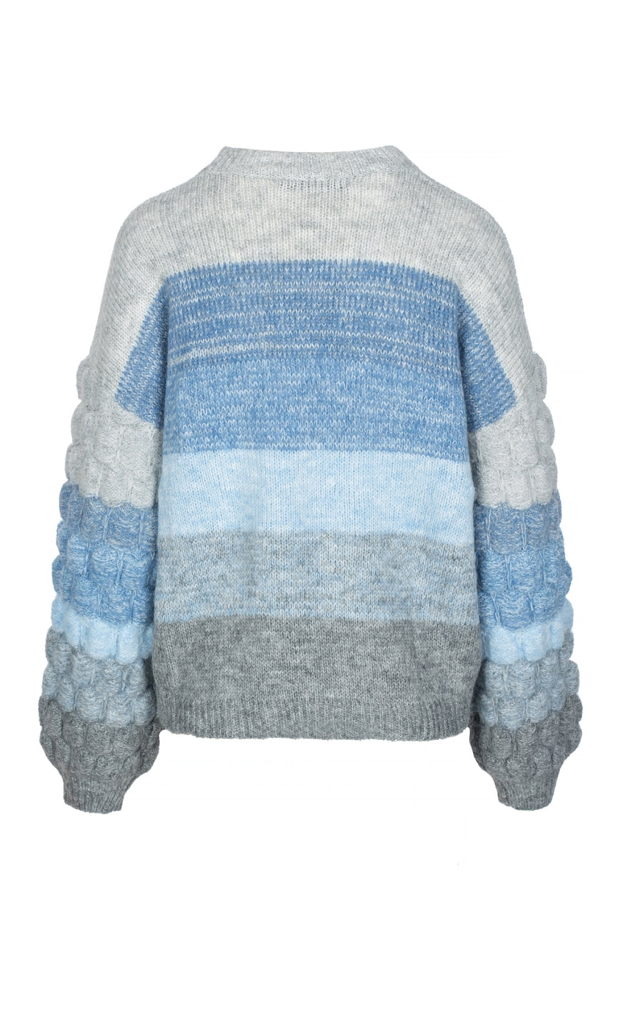 Strikken har en moderat løs pasform med lange løse ærmer.