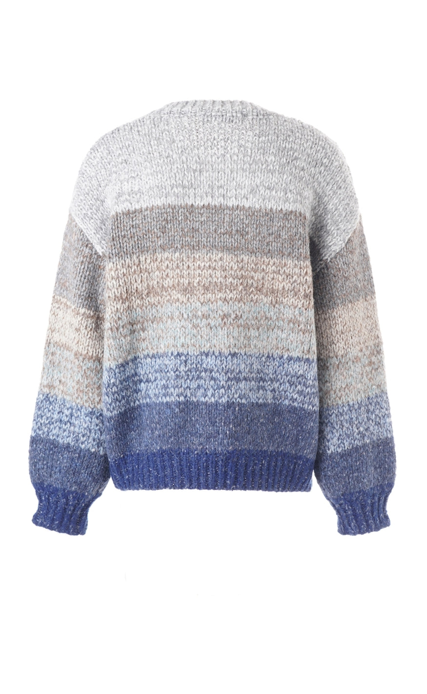 Striktrøje fra Luxzuz i et blødt og meleret design med brede farvestriber i blå, grå og beige nuancer.