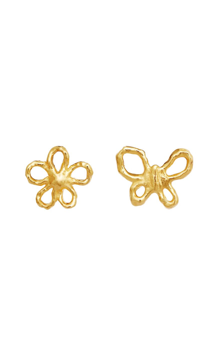 Smukke øreringe fra Maanesten i guldbelagt sølv med et organisk og håndlavet udtryk. Det asymmetriske design med blomst og sommerfugl skaber et legende og feminint look.