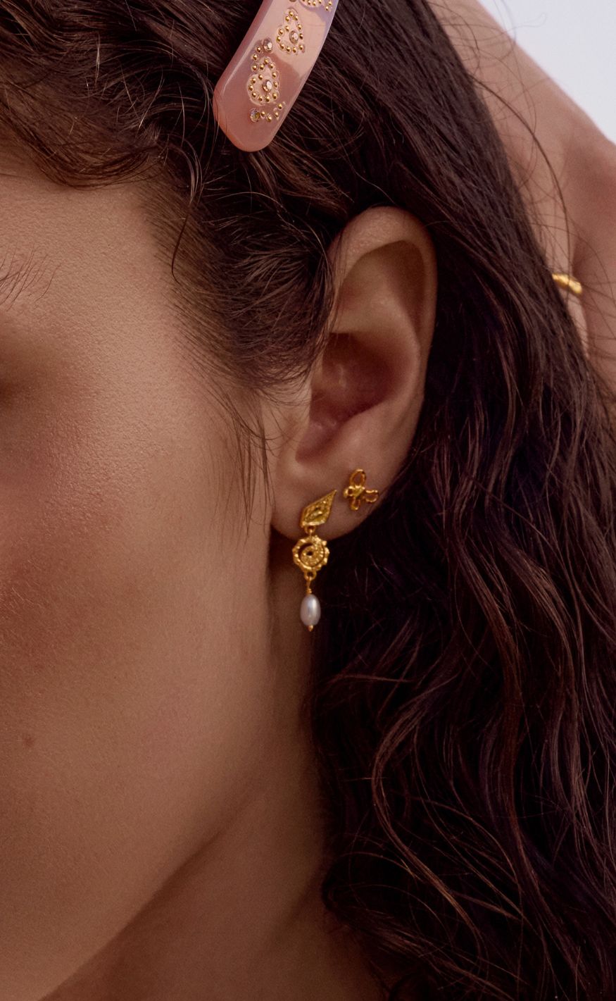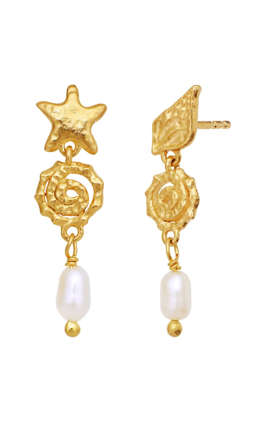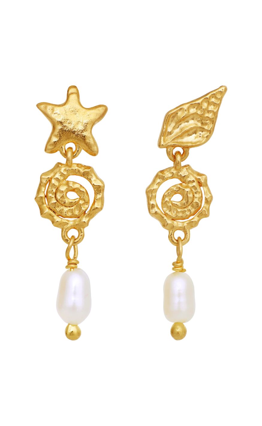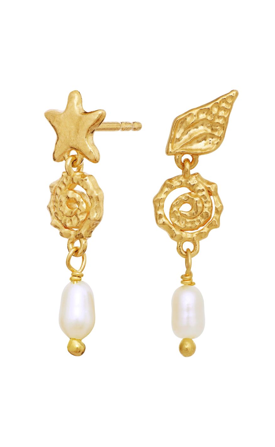 Unikke øreringe fra Maanesten i guldbelagt sølv med organiske, havinspirerede former. Kombinationen af stjerne- og muslingedetaljer, spiralform og en vedhængt ferskvandsperle skaber et drømmende og kunstnerisk udtryk.