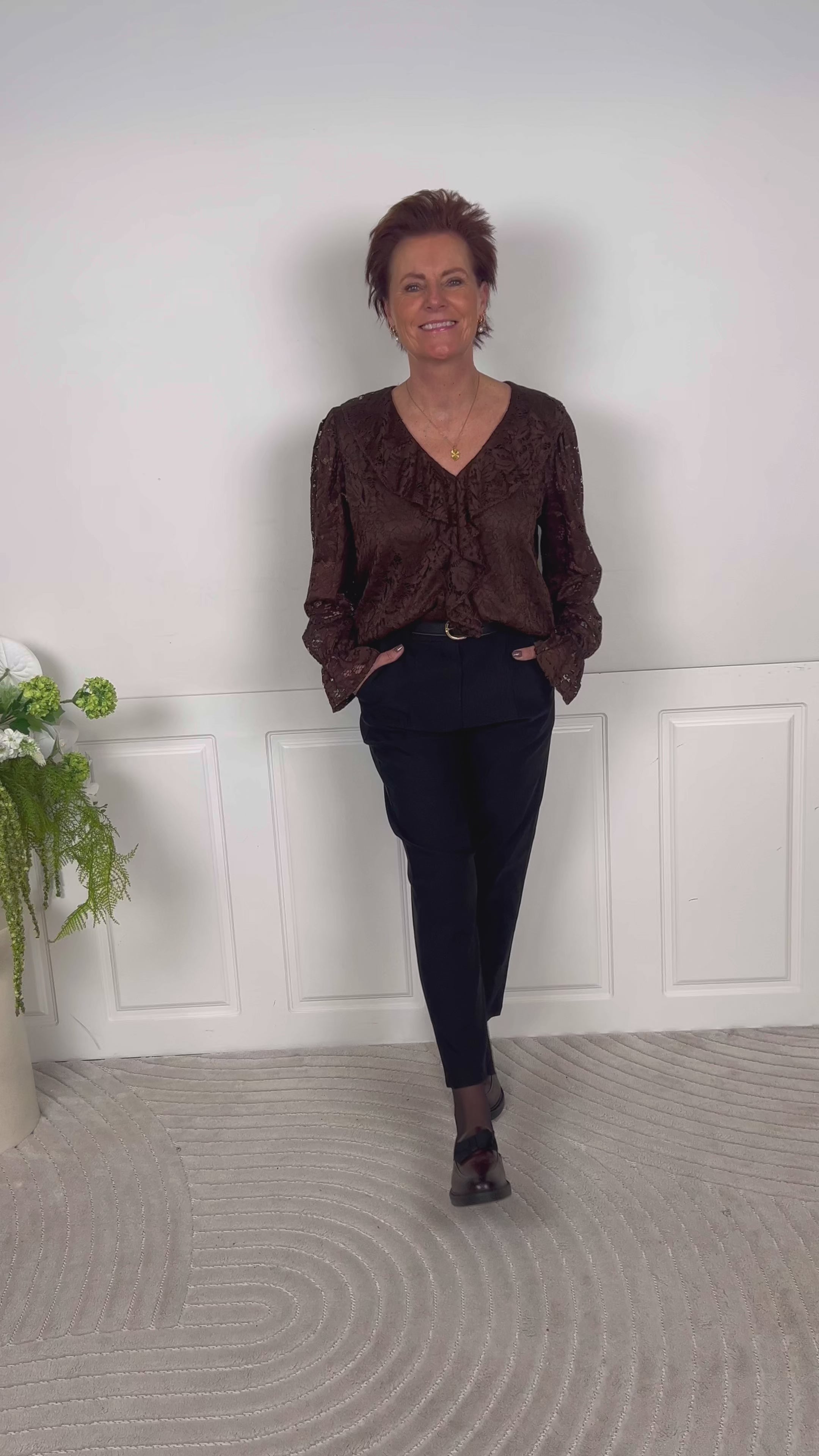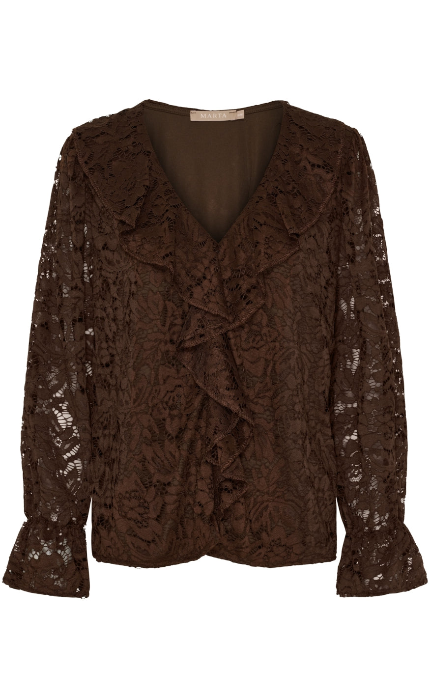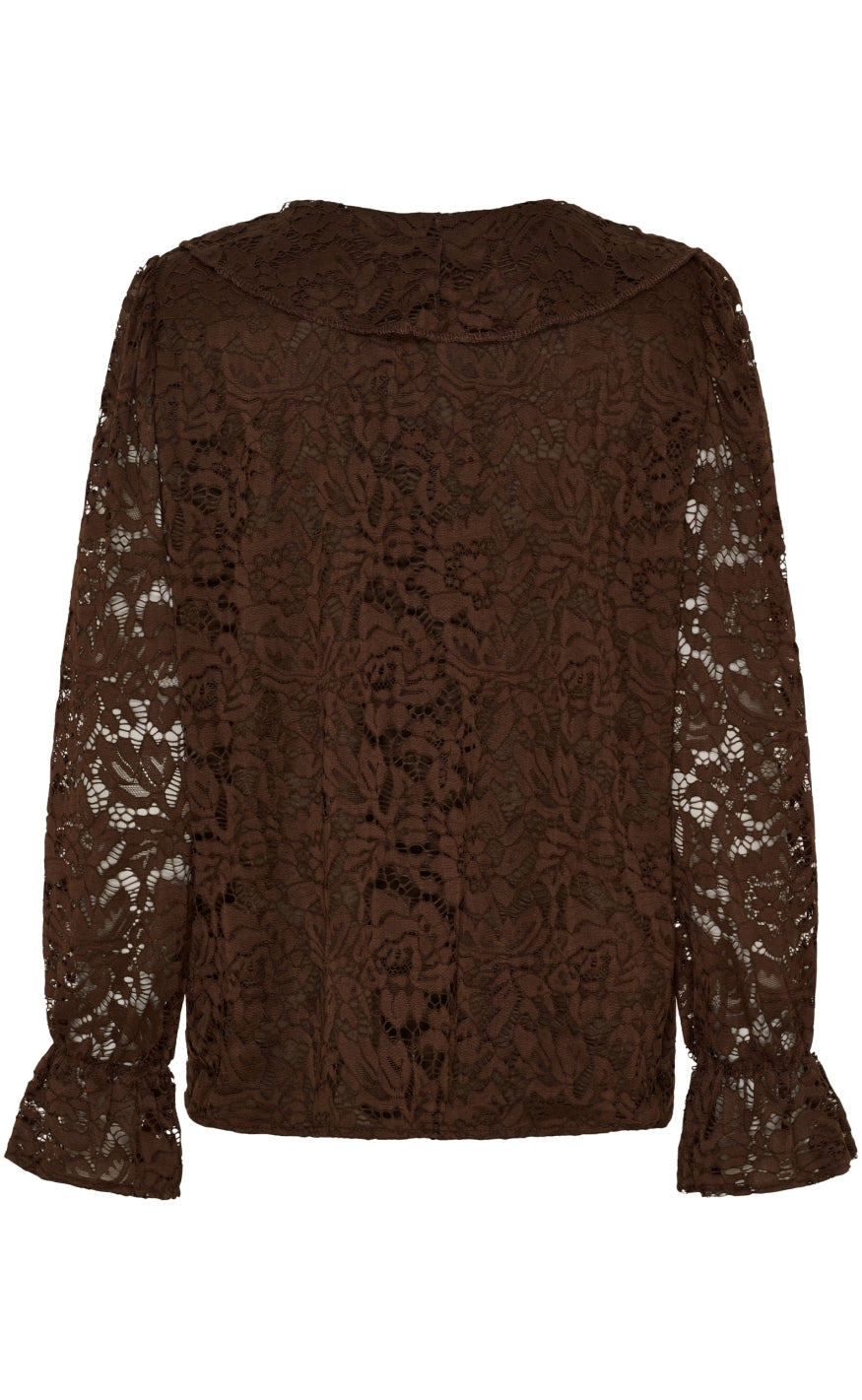 Blusen har lange ærmer med elastiske manchetter og en flot flæsekant langs den dybe V-udskæring. Det gennembrudte blonde-design giver et romantisk og stilfuldt look – perfekt til festlige anledninger eller som statement-piece til hverdagsoutfit.