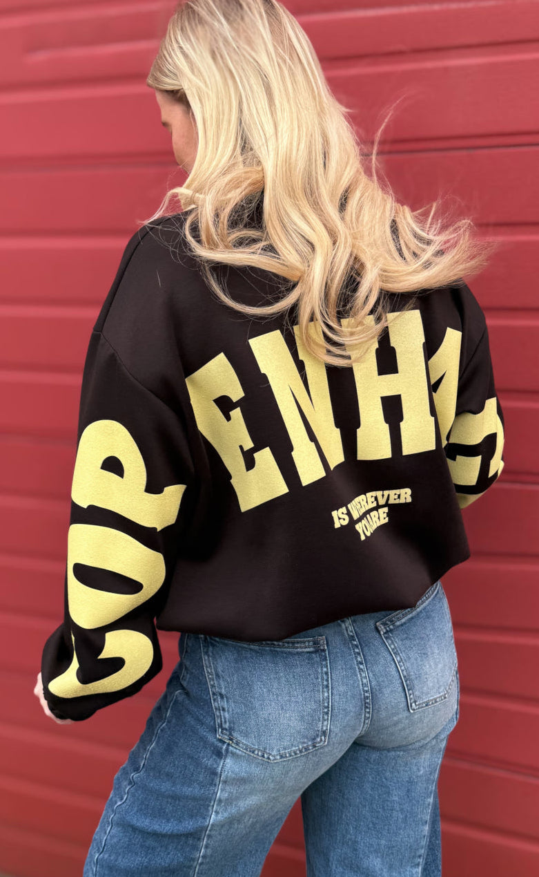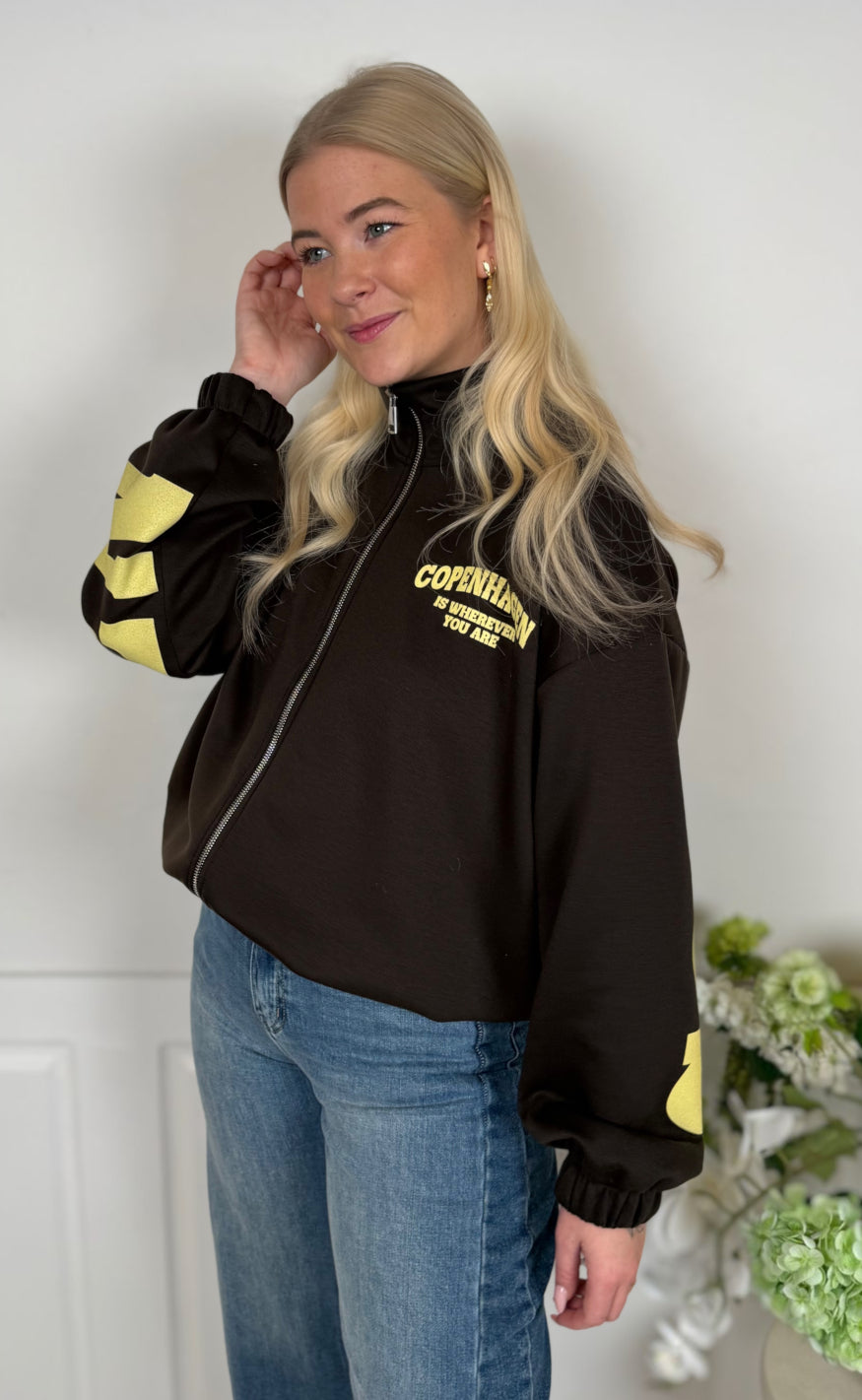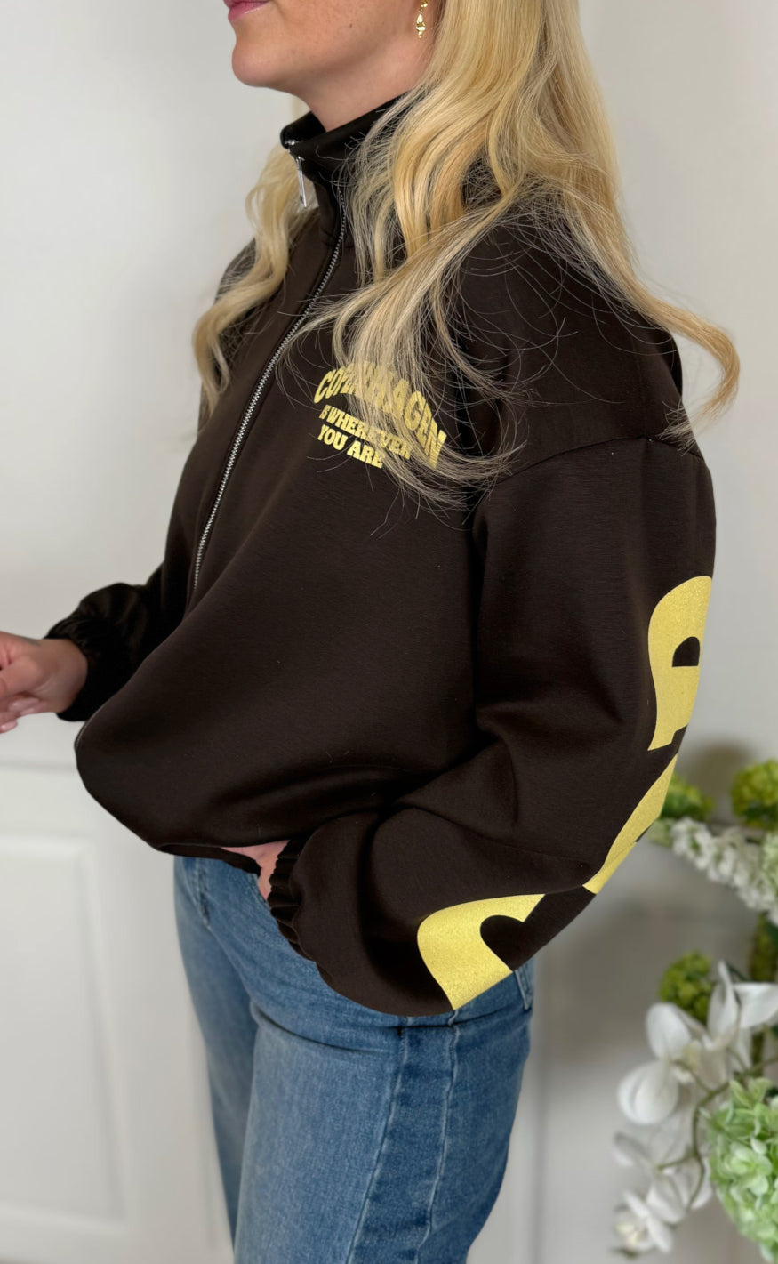 Jakken har høj krave, lynlåslukning foran, elastik ved talje og ærmer samt grafisk tekstprint på bryst og ærmer, som giver et sporty og moderne udtryk.
