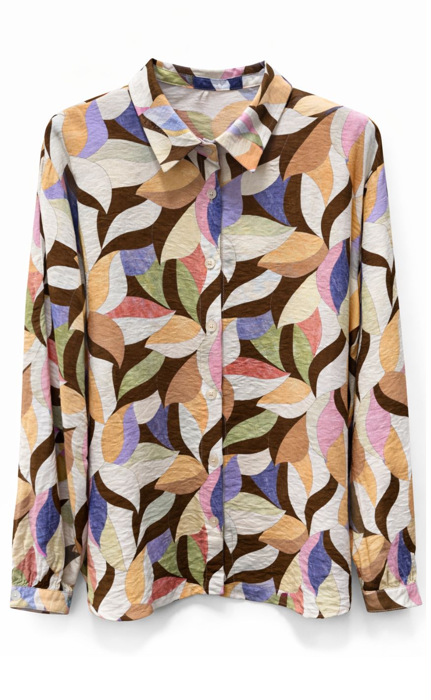Let og feminin skjorte fra Marta Du Chateau med et smukt, grafisk bladmønster i brune nuancer.