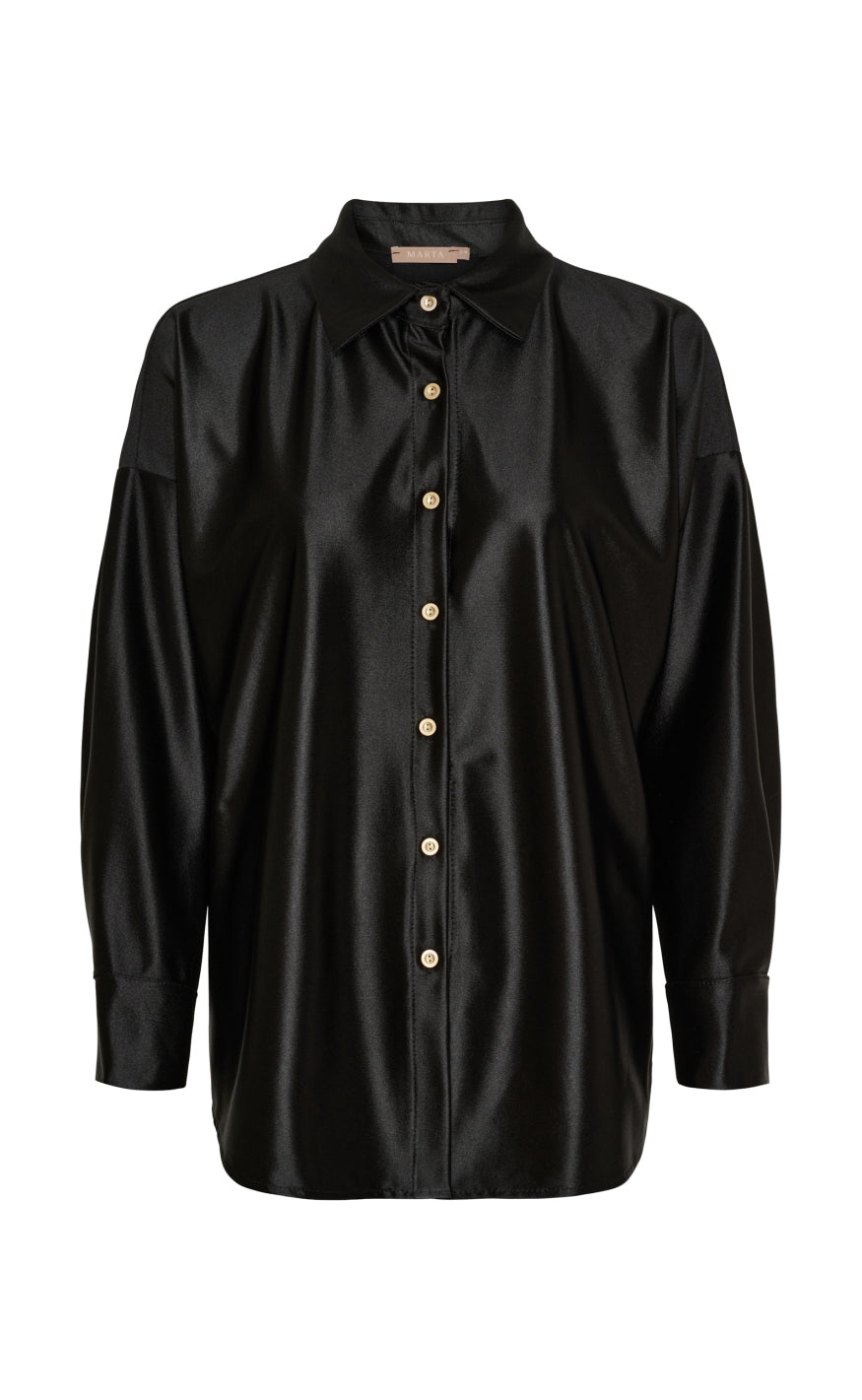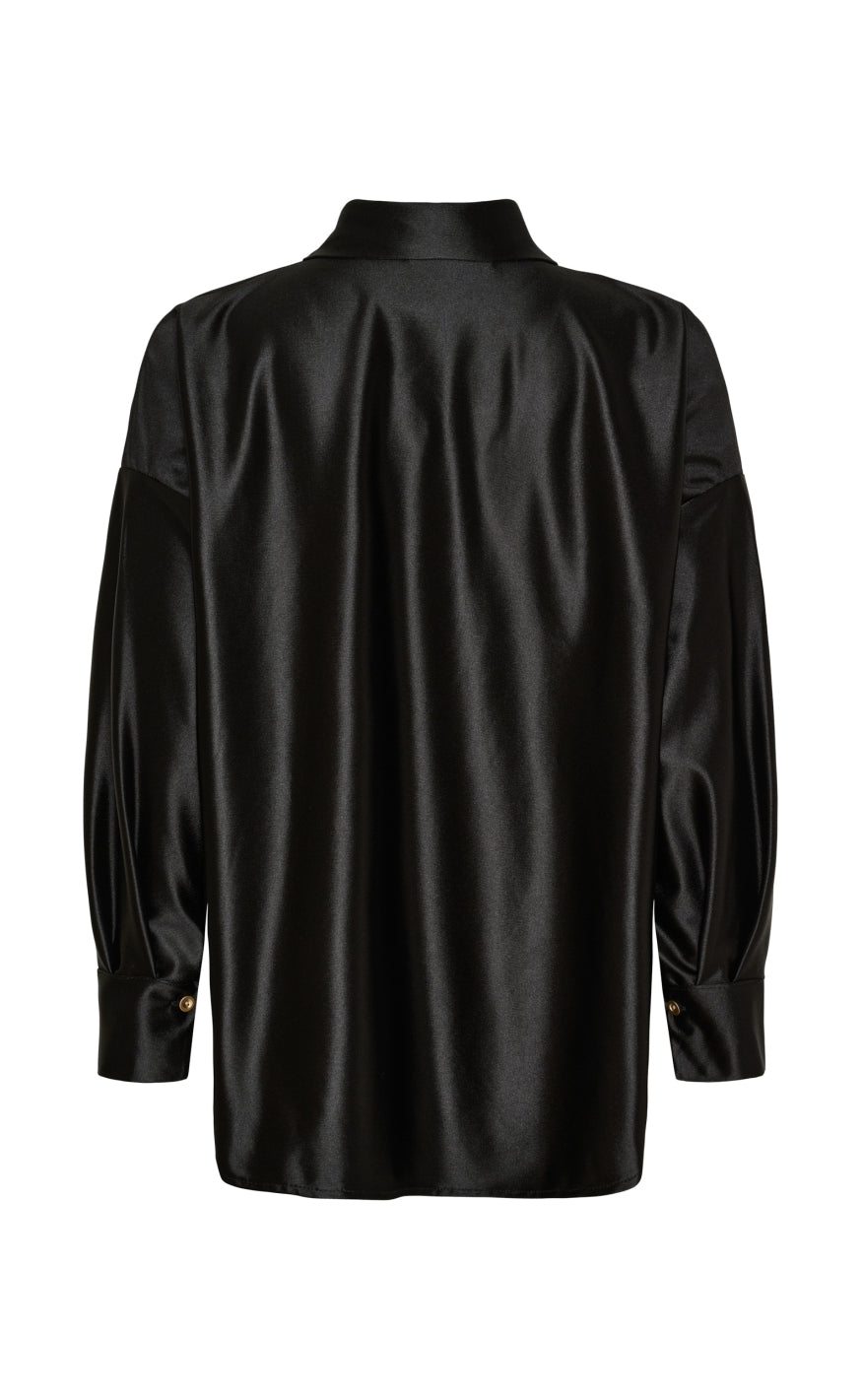 Skjorten har klassisk krave, lange ærmer med manchetter og knaplukning foran. Den har en løs pasform, der giver et sofistikeret og stilfuldt udtryk – perfekt til både hverdag og festlige anledninger.