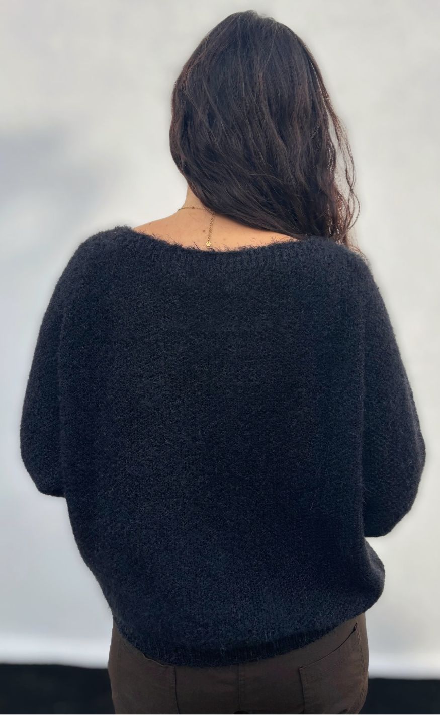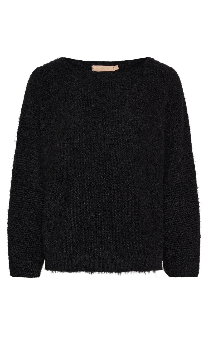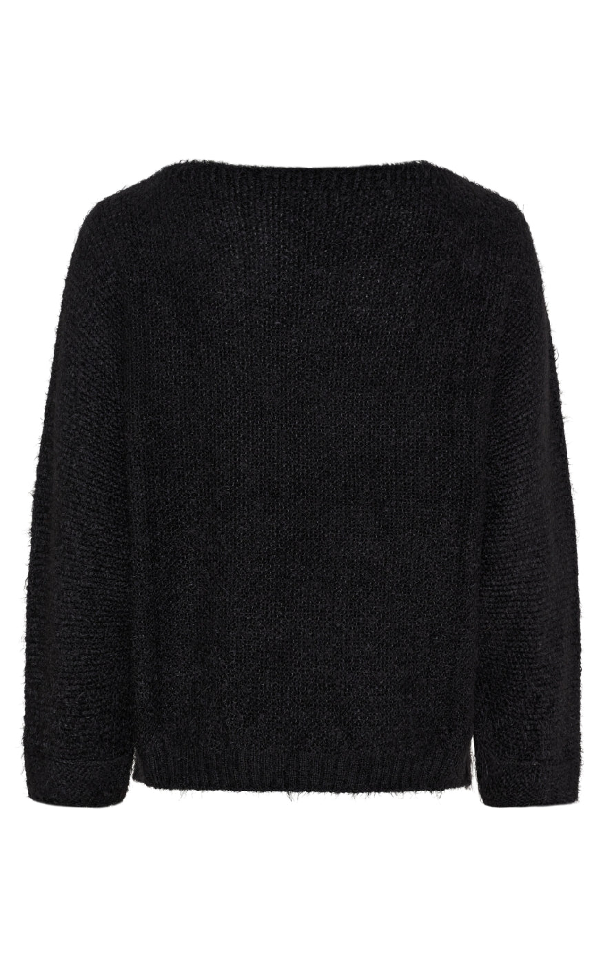 Denne strik er i en sort farve, og har en stor halsudskæring.