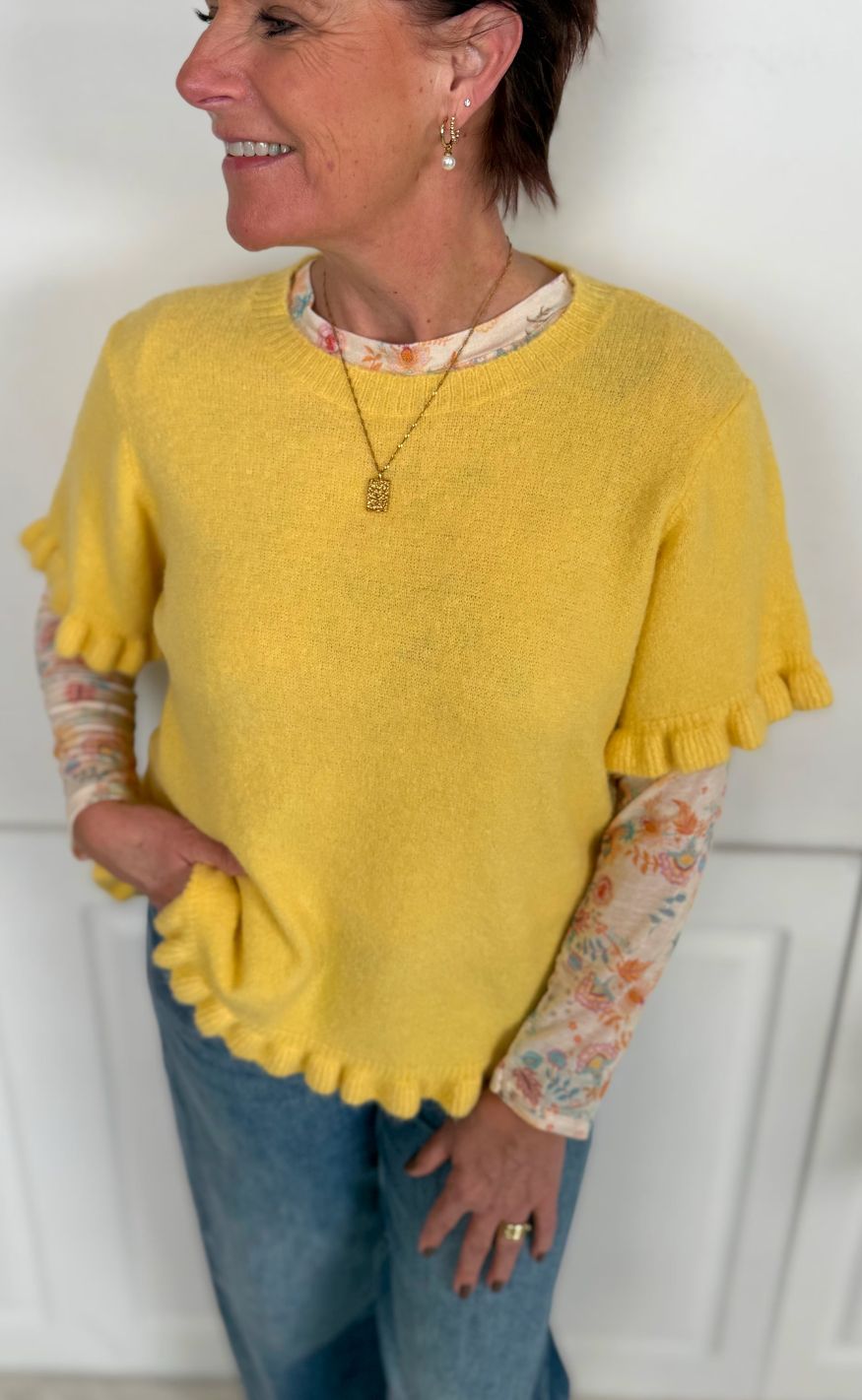 Kortærmet strikbluse i gul med blød, fluffy tekstur.