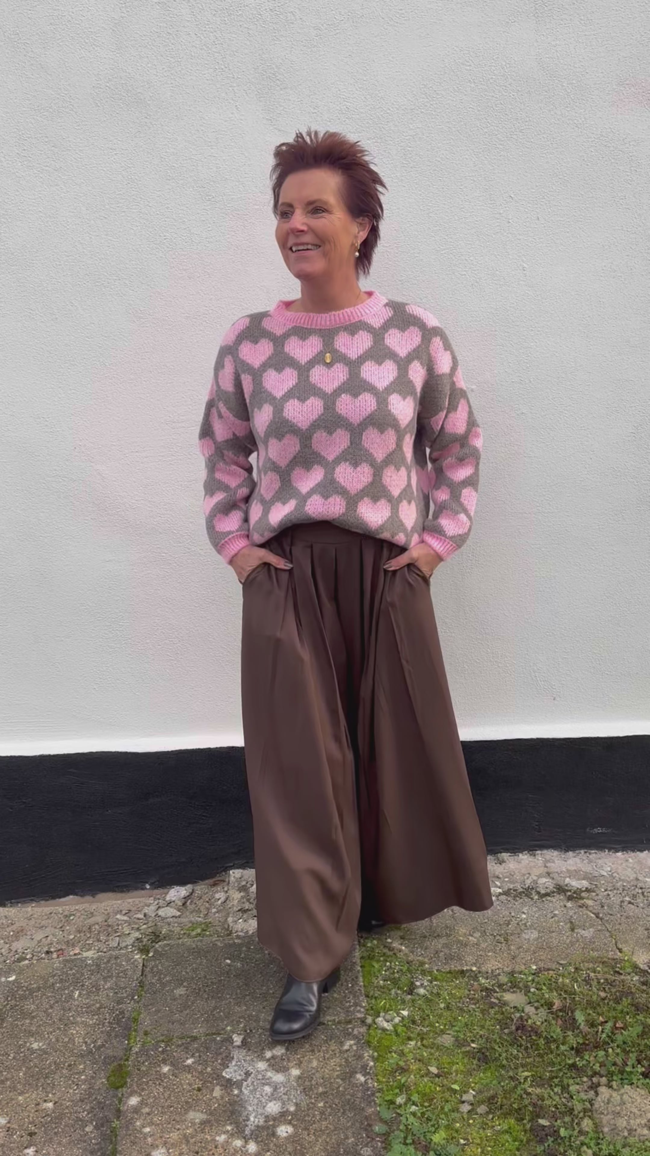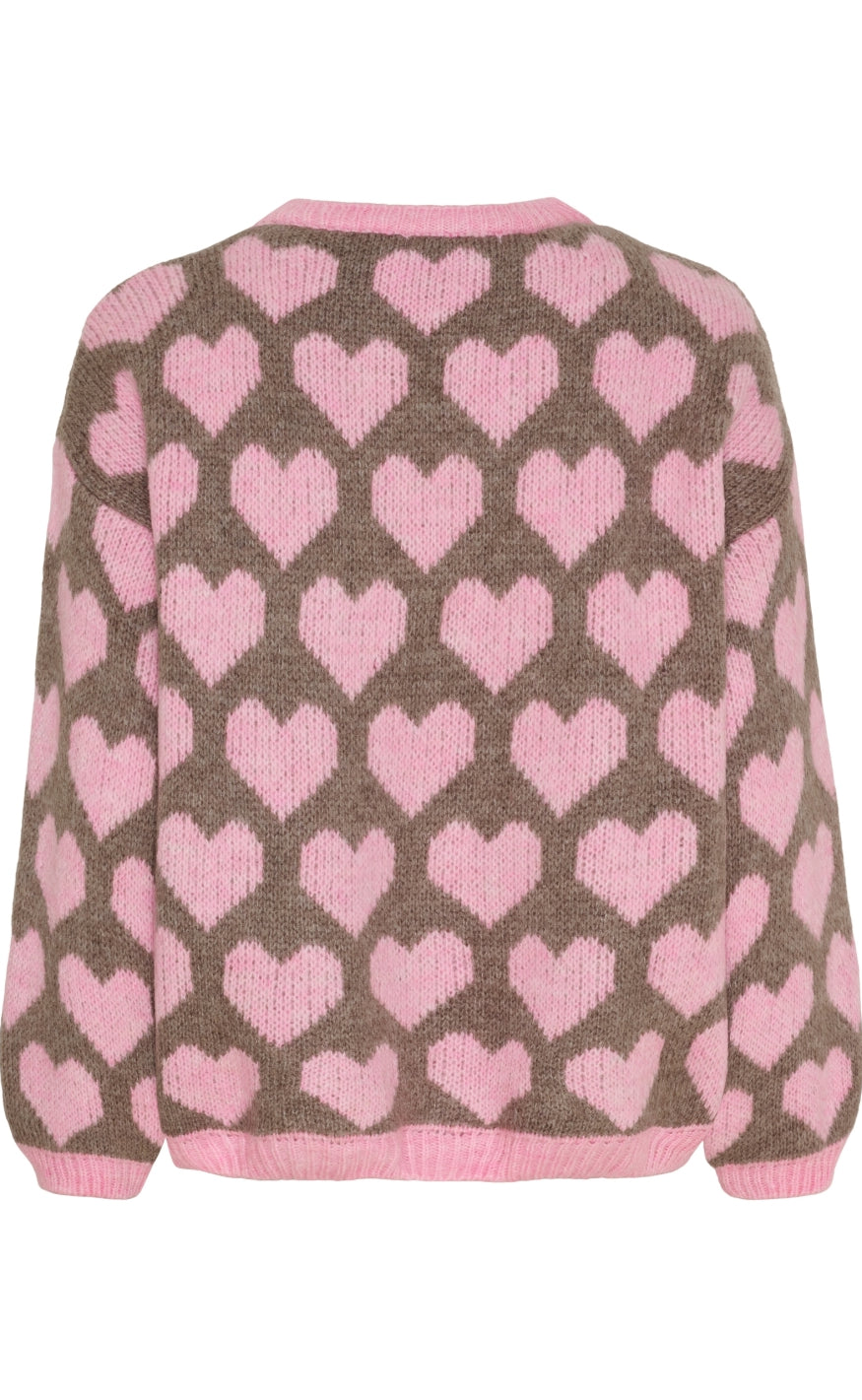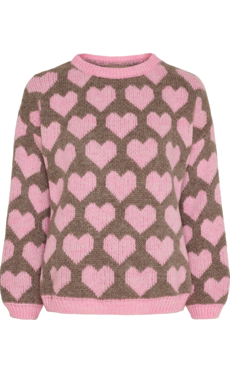 Blød striktrøje fra Marta Du Chateau i brun med lyserøde hjerter over hele designet.