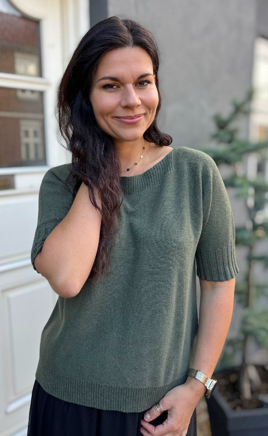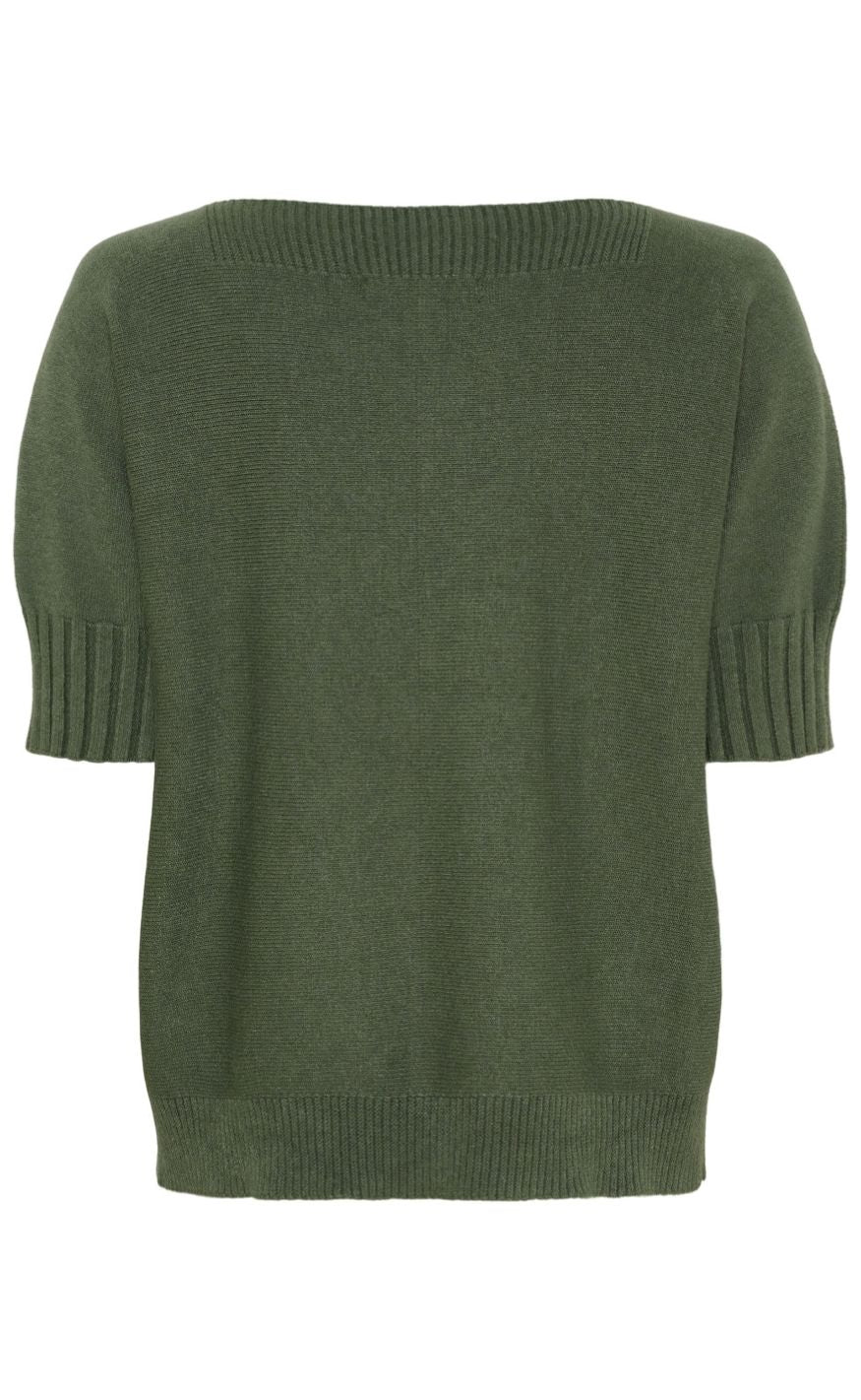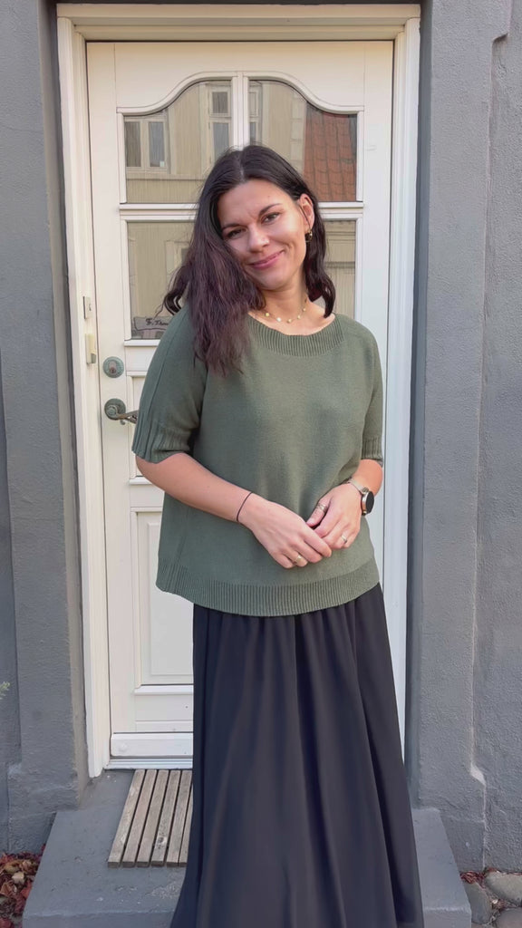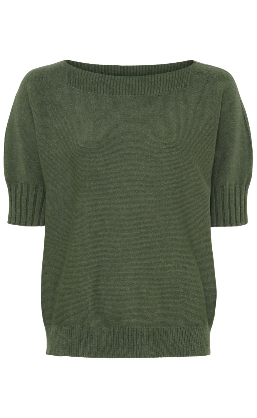 Lækker og blød strik, med korte ærmer og en stor halsudskæring.