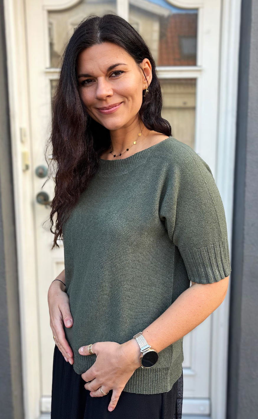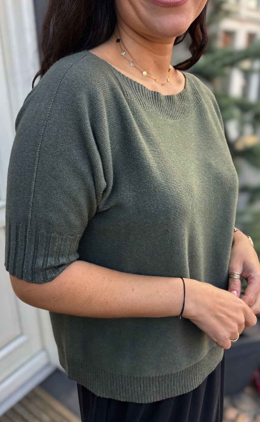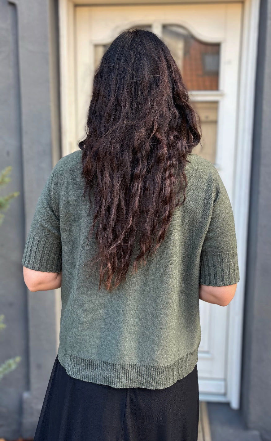 Lækker og blød strik, med korte ærmer og en stor halsudskæring.