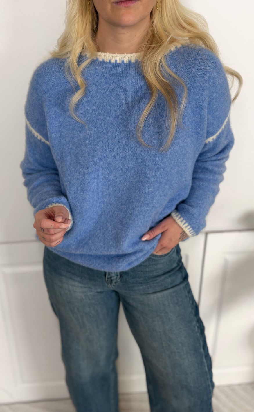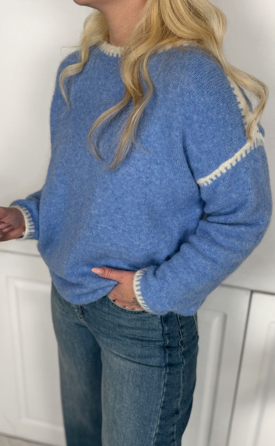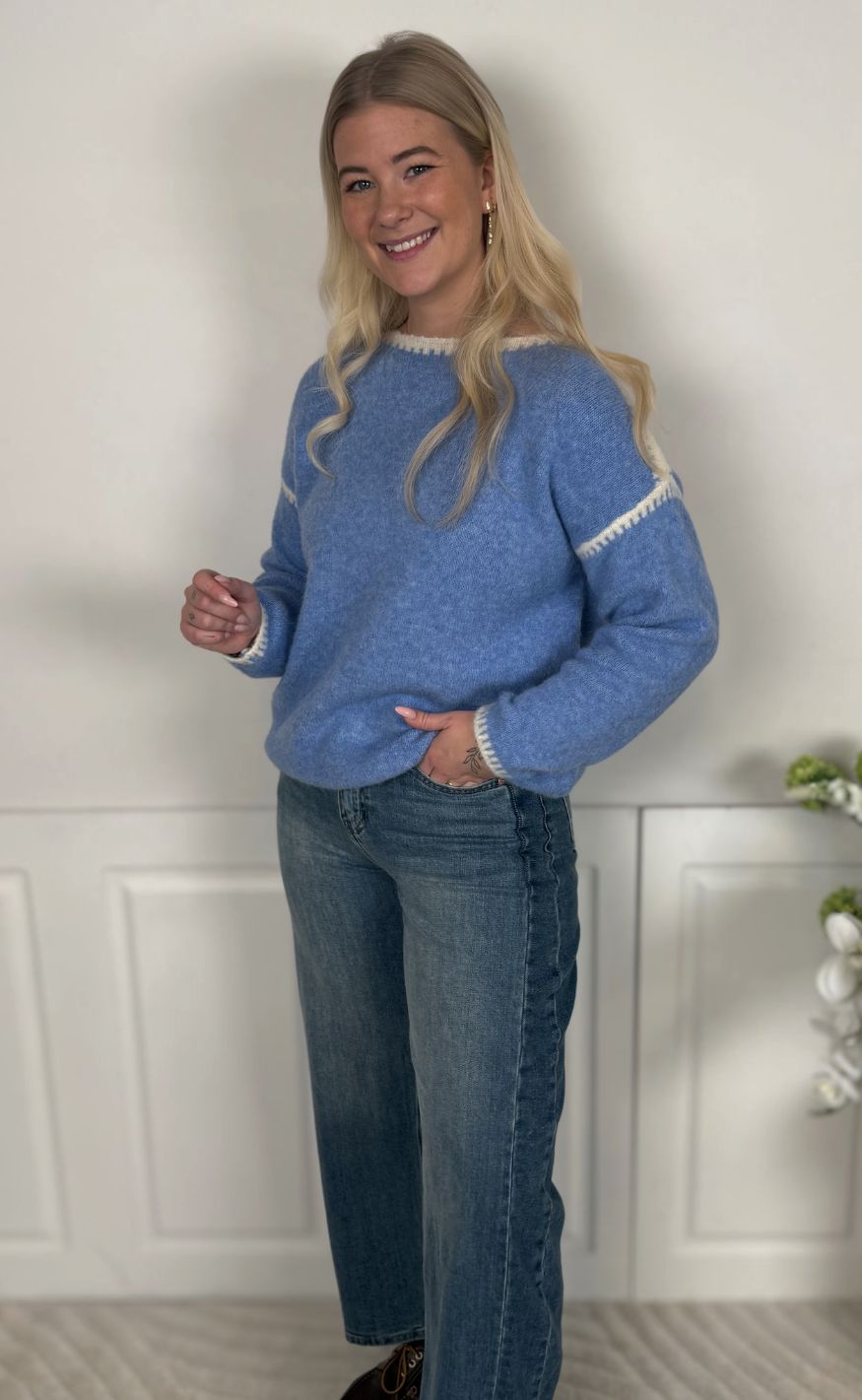 Hvide kantdetaljer ved hals, skuldre og bund giver et diskret, stilrent udtryk.