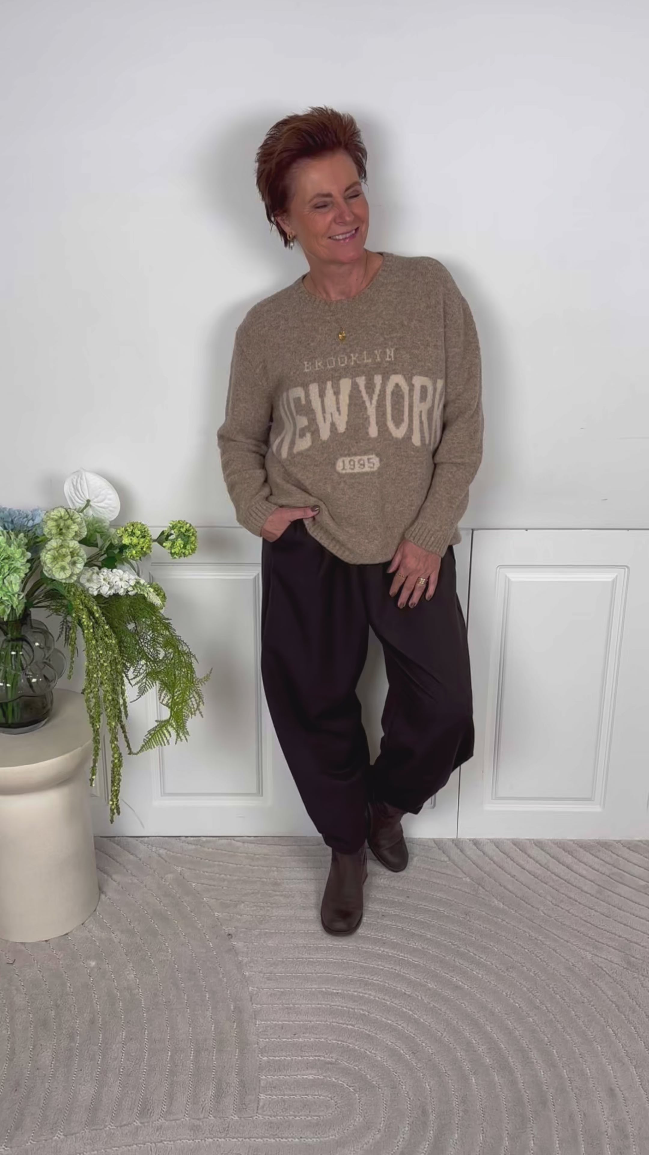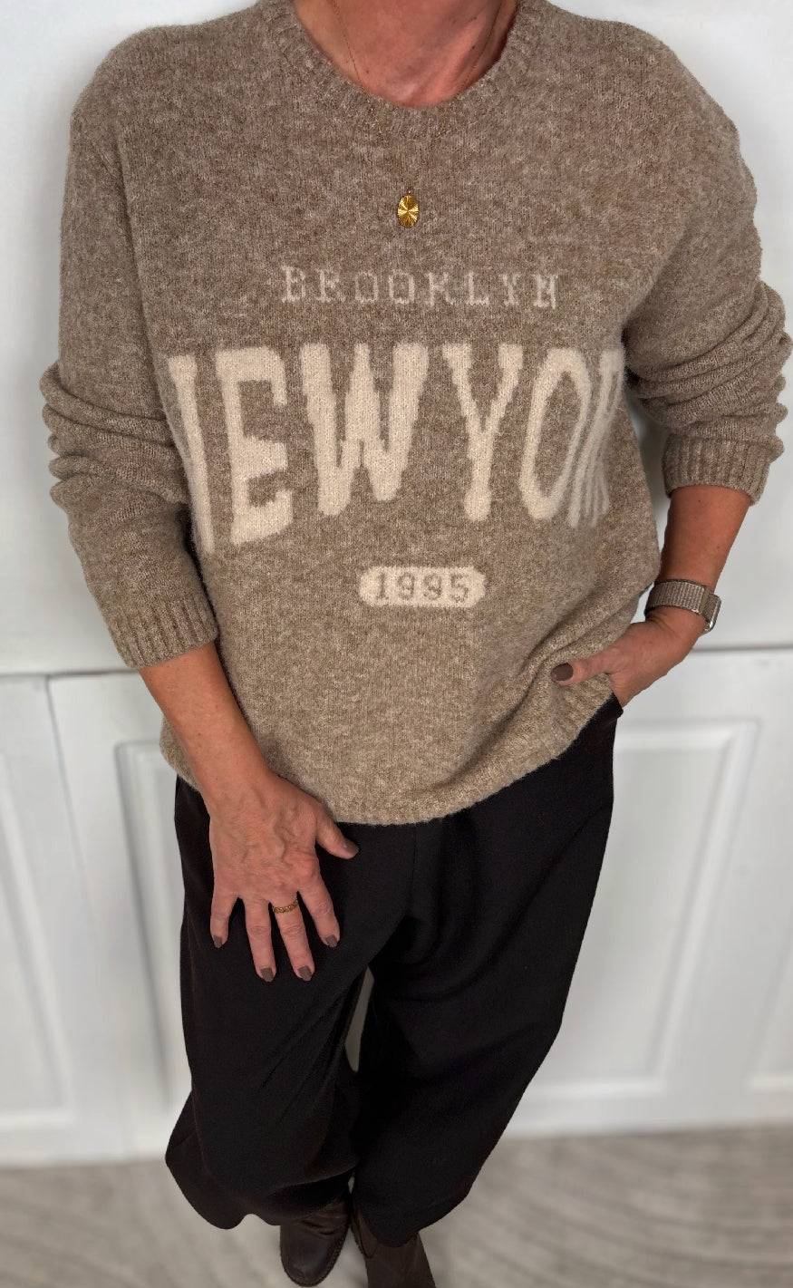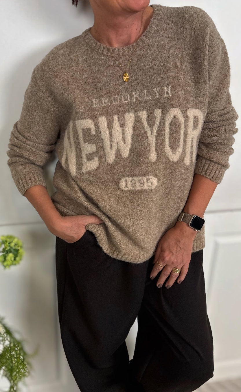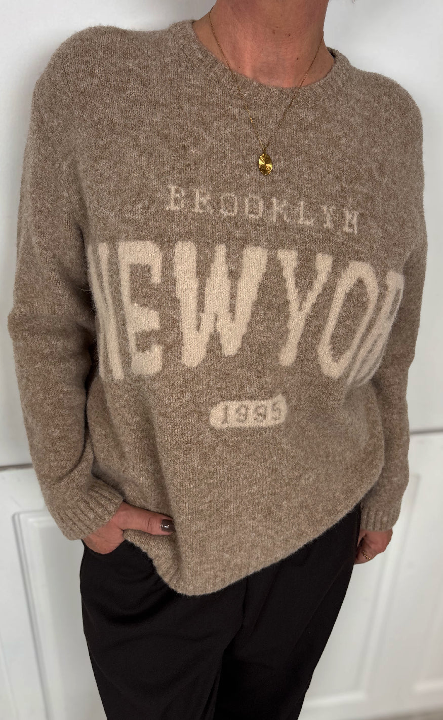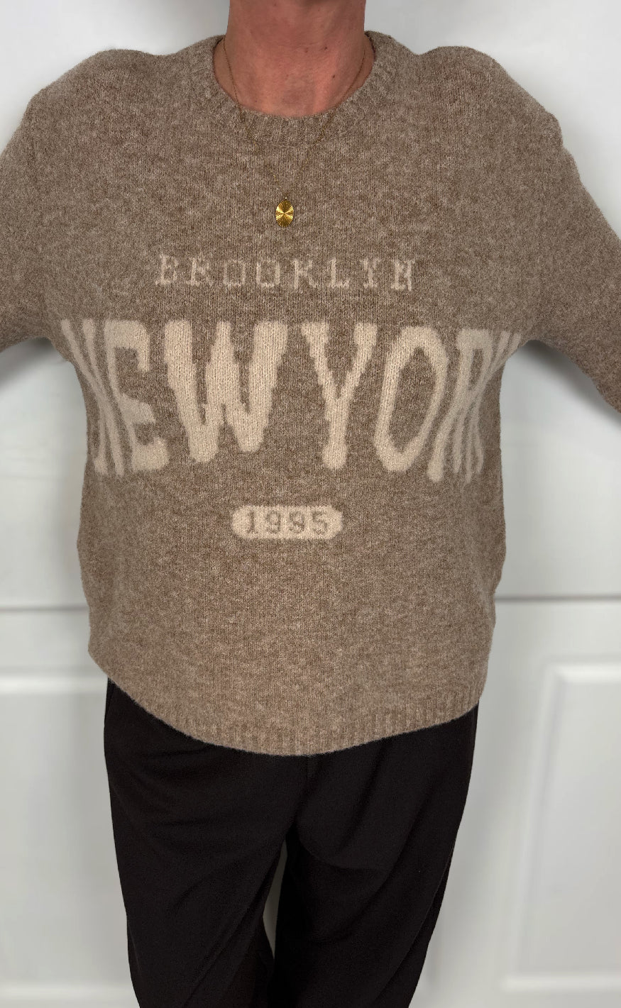 Trøjen har rund hals, lange ærmer og et afslappet fit. På forsiden står teksten Brooklyn New York i et stort, kontrastfyldt design, som giver et cool og casual look.
