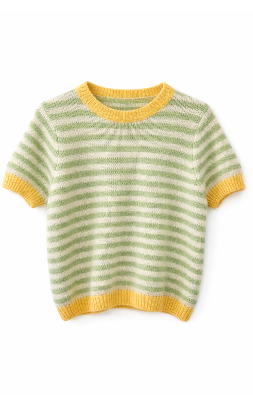 Kortærmet strikbluse med vandrette striber i mintgrøn og hvid. Gule ribkanter ved hals, ærmer og bund tilføjer et friskt og legende touch.