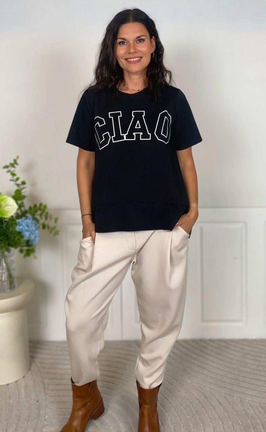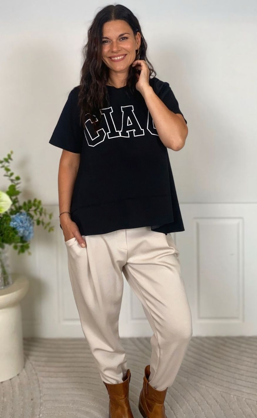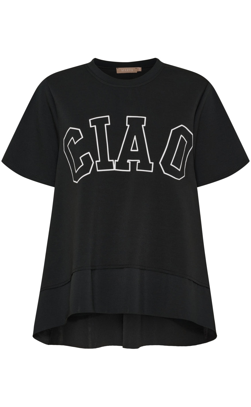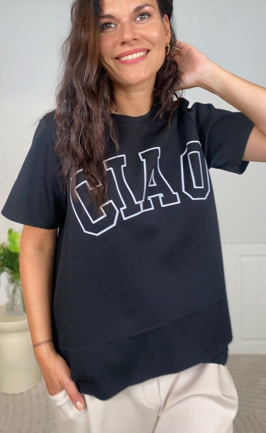 Denne t-shrit har korte ærmer, og skrift på brystet.