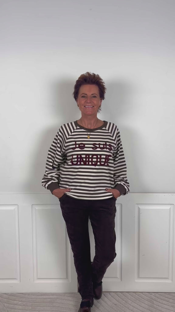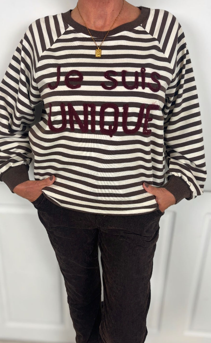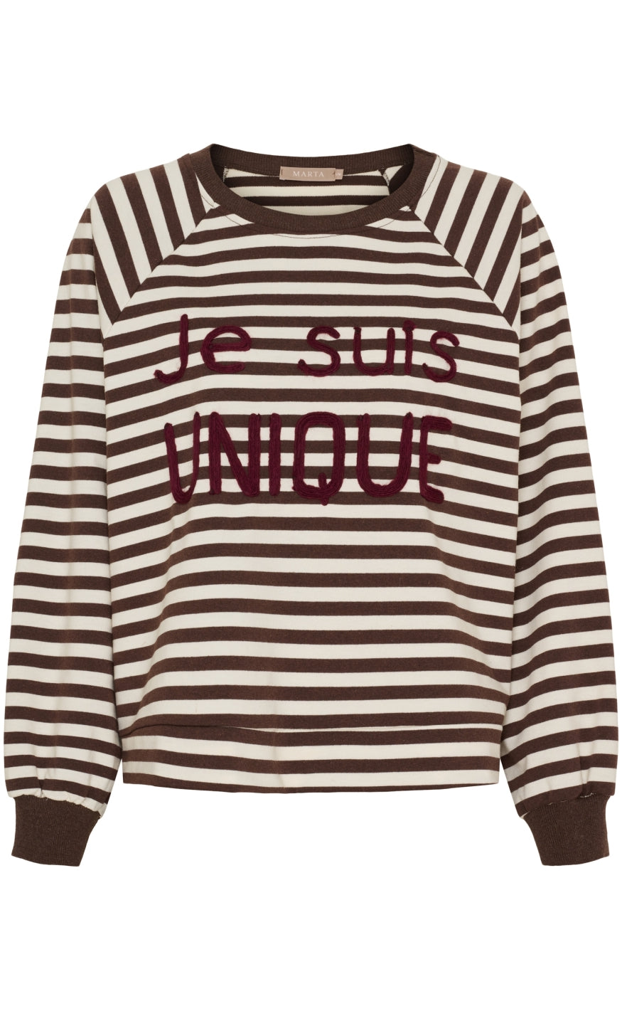 Flot sweatshirt fra Marta Du Chateau i et stribet print, med fransk tekst stående på brystet.