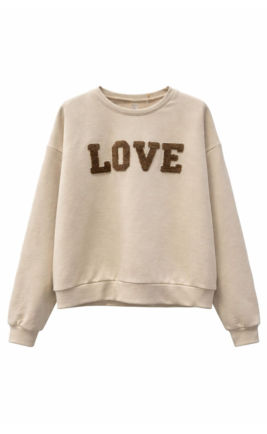 Blød og casual sweatshirt fra Marta Du Chateau i en klassisk beige melange med dekorativt “LOVE”‑tekst i pink boucle på fronten.