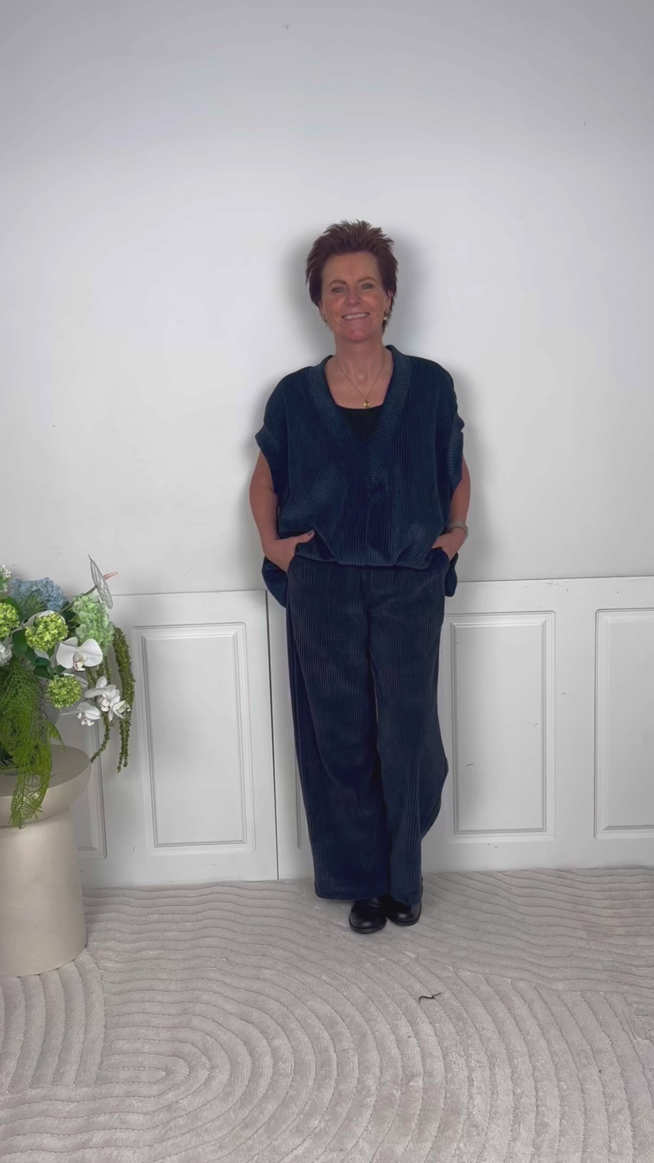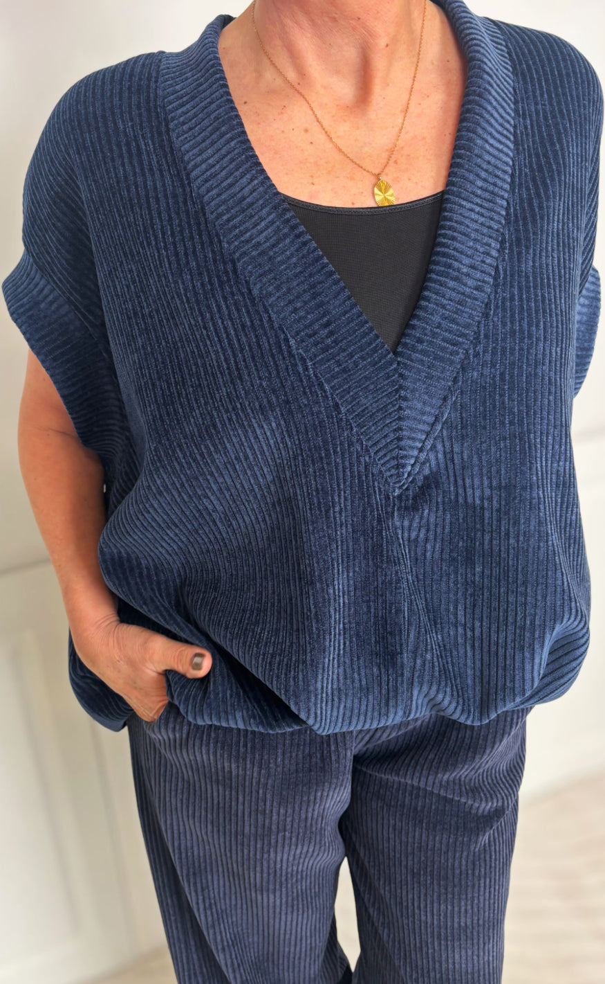 Vesten har en dyb V-udskæring og brede skuldre, der giver et moderne og afslappet look. Perfekt til at style over en skjorte eller bluse for et lag-på-lag outfit.