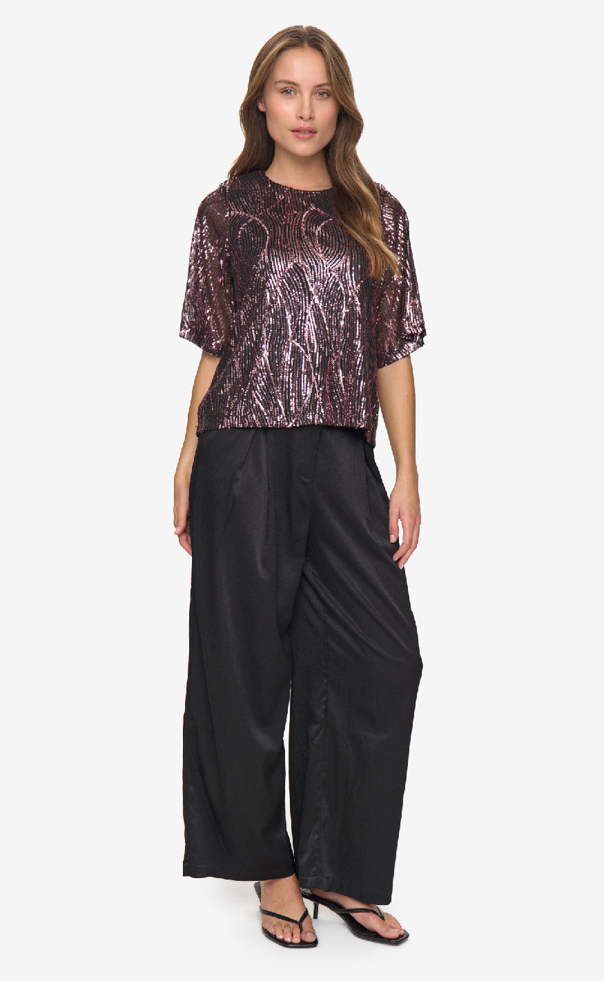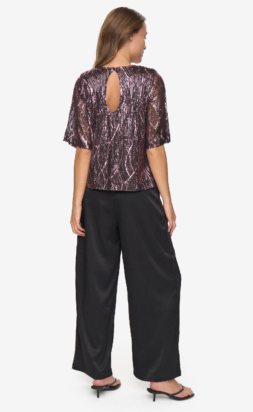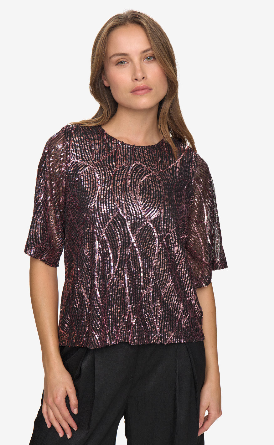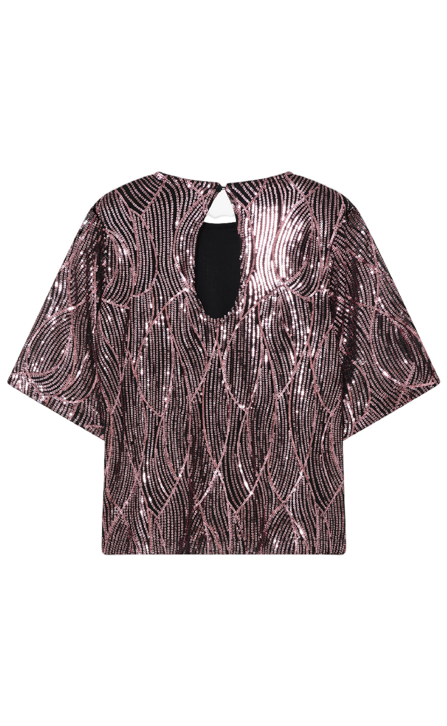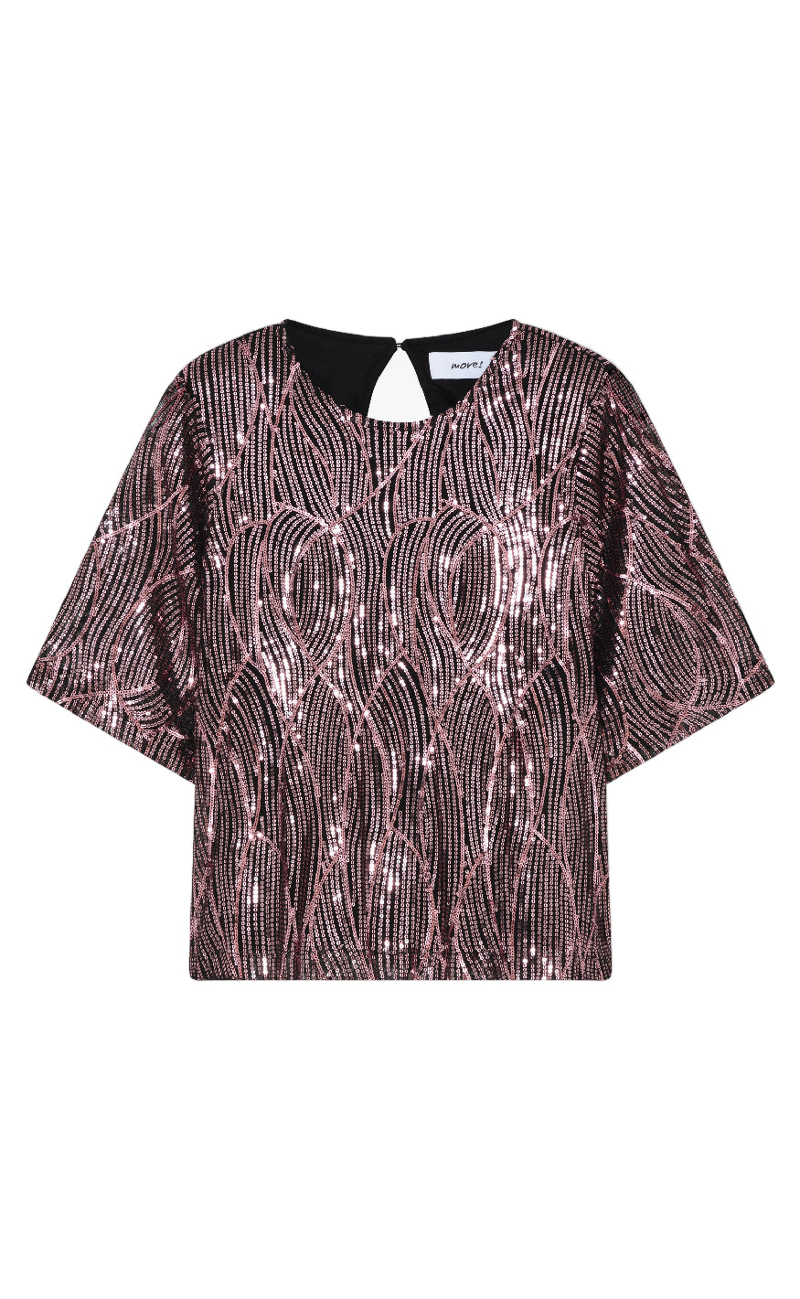 Denne bluse fra Moves er en glitrende top med korte ærmer og et elegant mønster i rosa og sorte pailletter, som giver et festligt og sofistikeret udtryk.