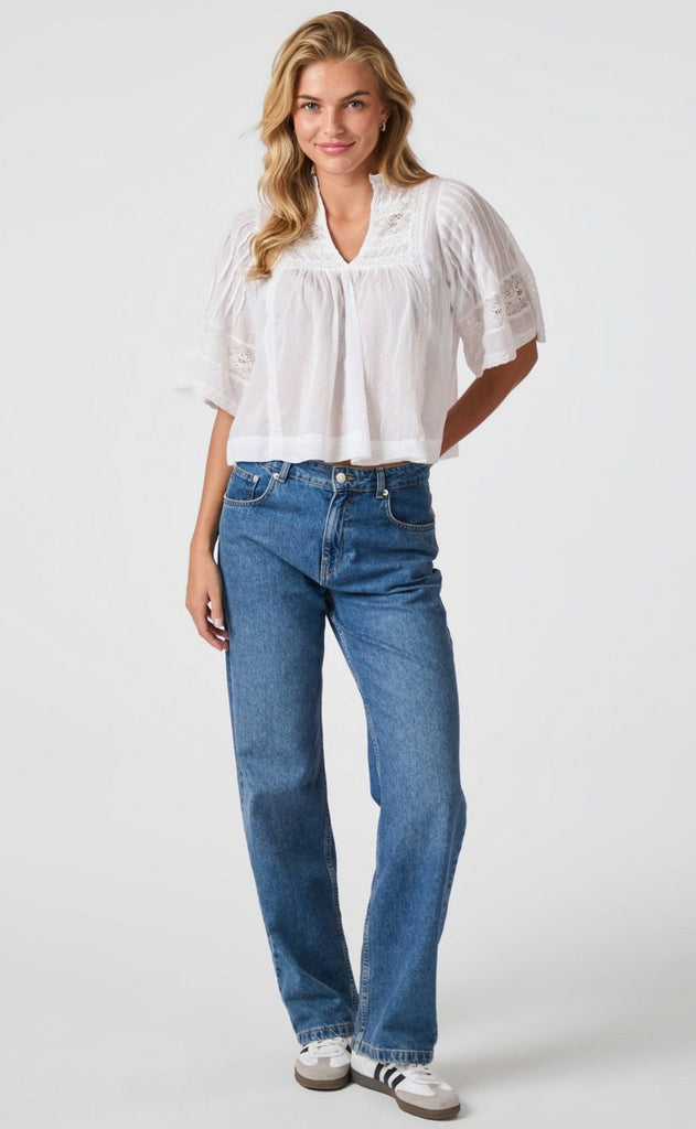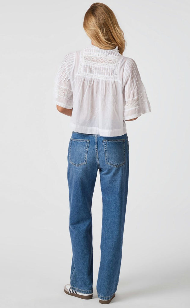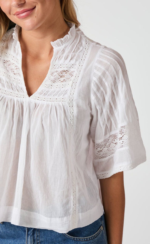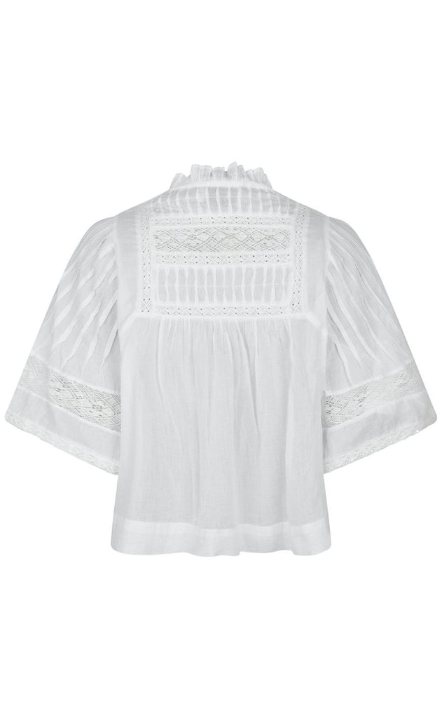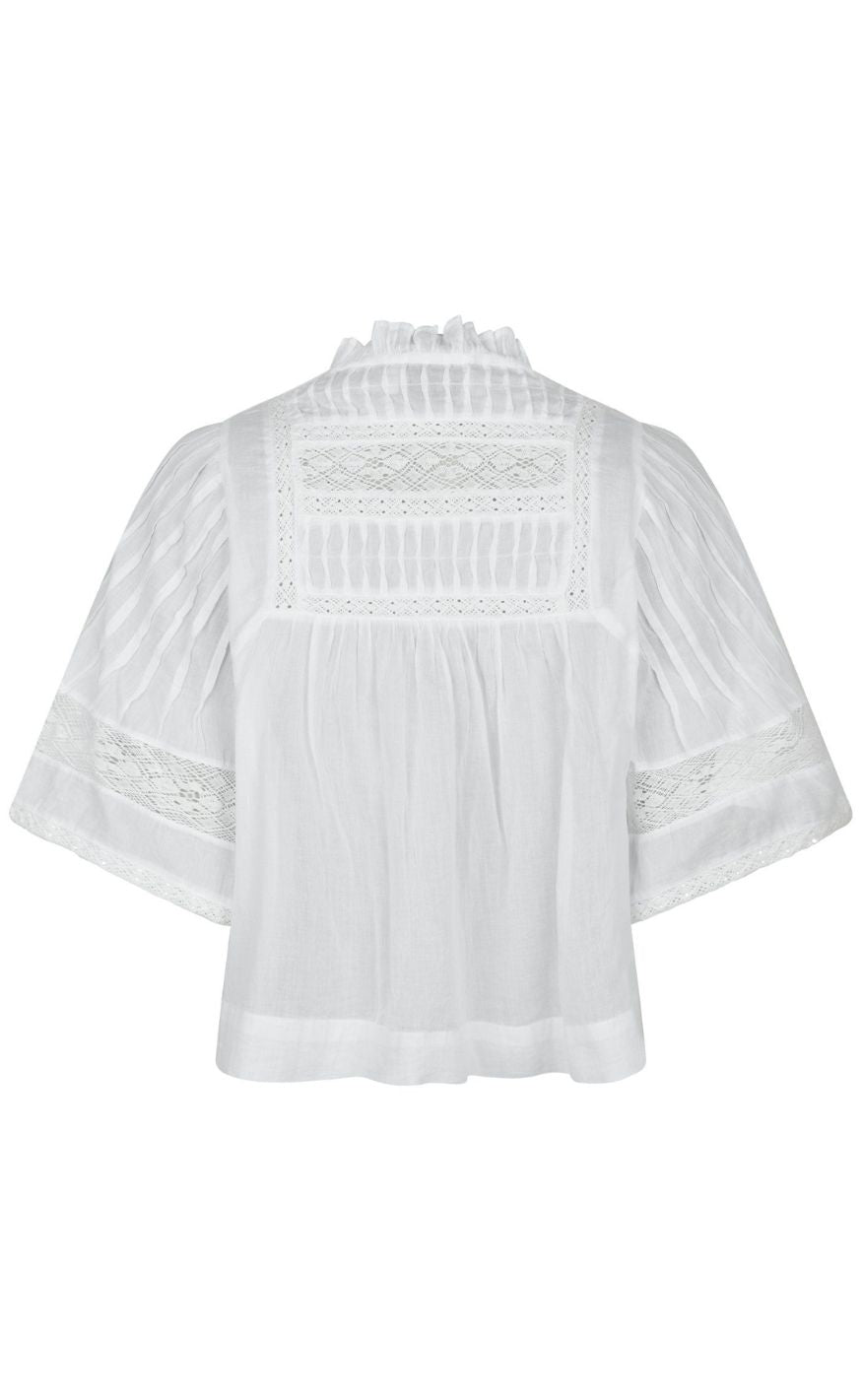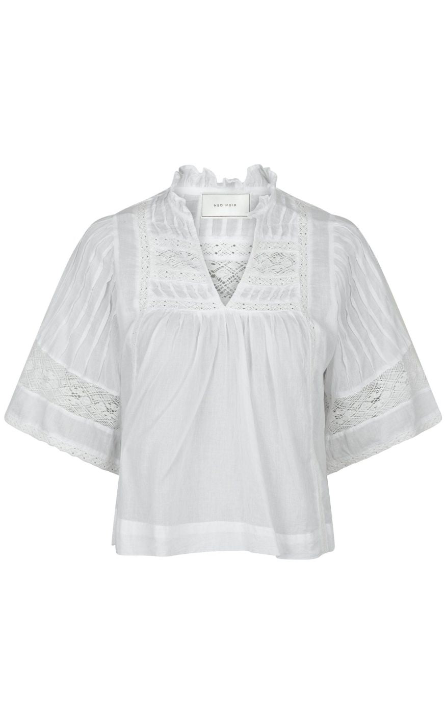 Smuk og feminin bluse i hvid fra Neo Noir med mange smukke detaljer i form a bånd påsætninger og små læg.