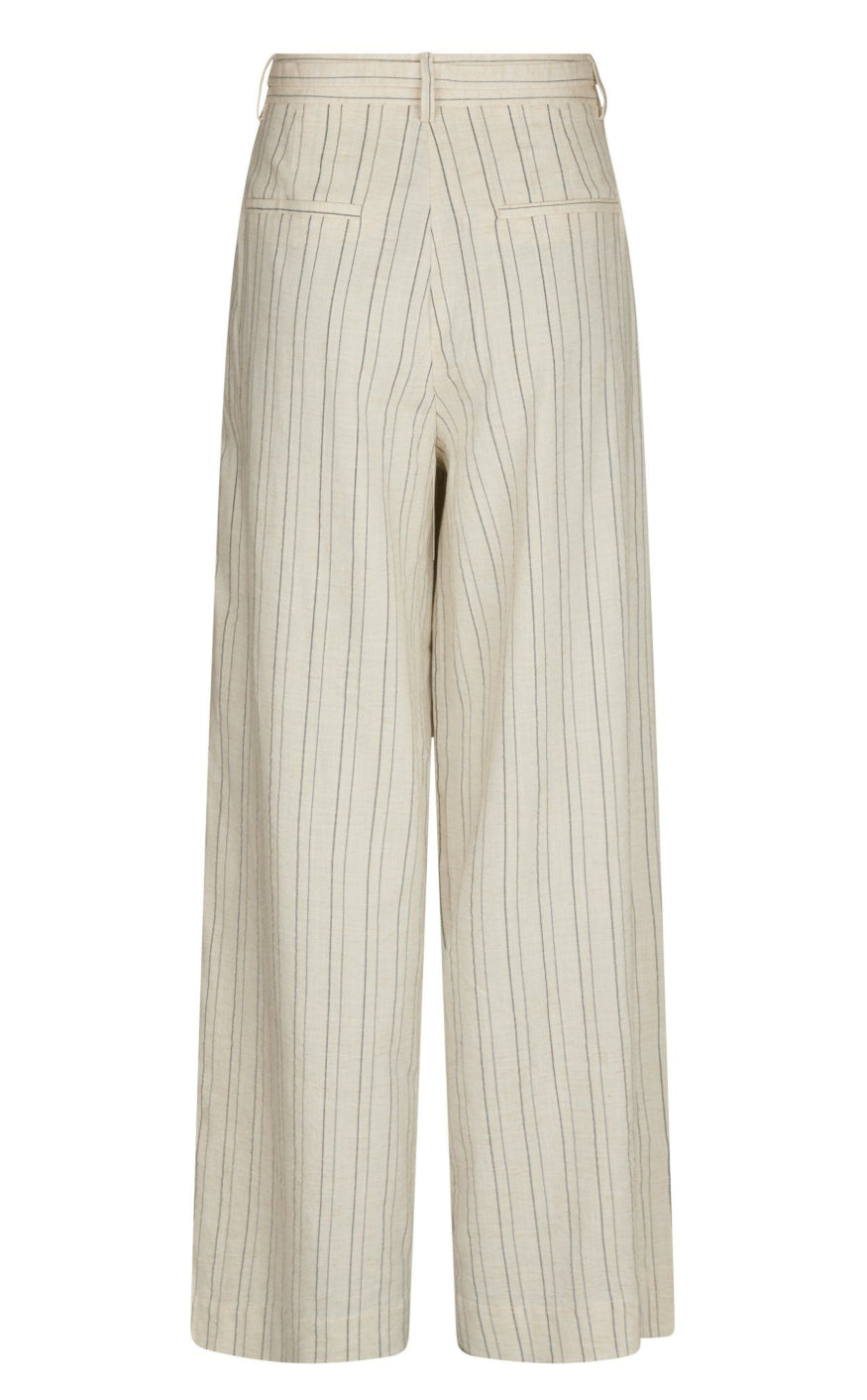 Bukserne har lige ben, høj talje og et smalt bindebælte, som giver et elegant og moderne udtryk.