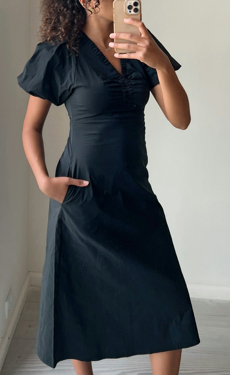 Elegant lang kjole med feminin V-udskæring, let markeret talje og lommer.