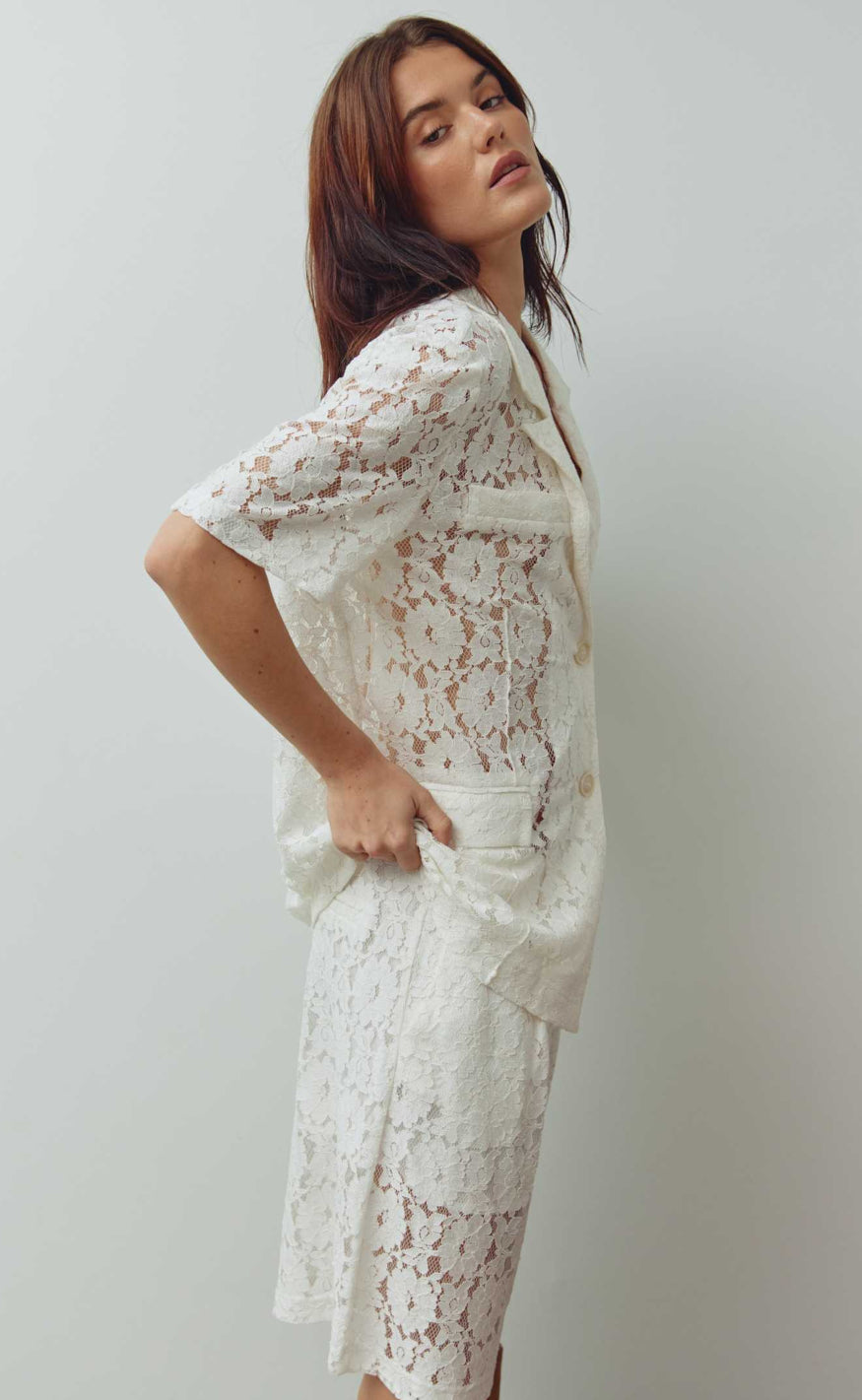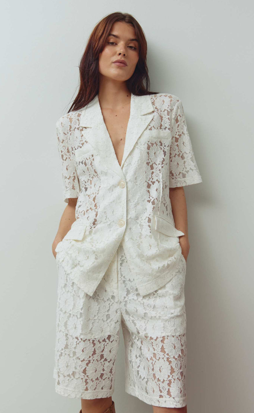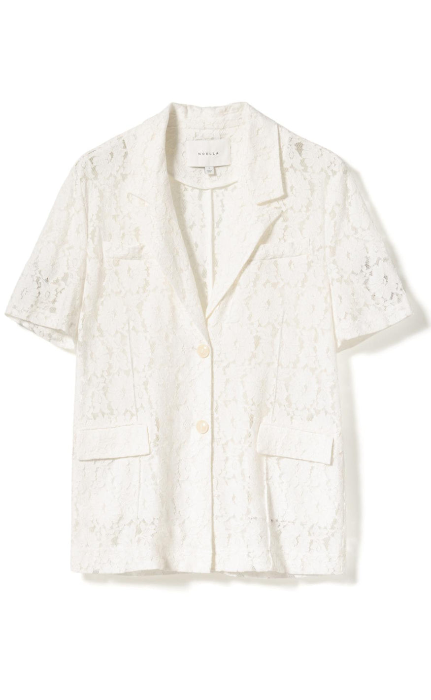 Elegant blazer fra Noella i en hvid blondekvalitet med et feminint og detaljerigt udtryk.