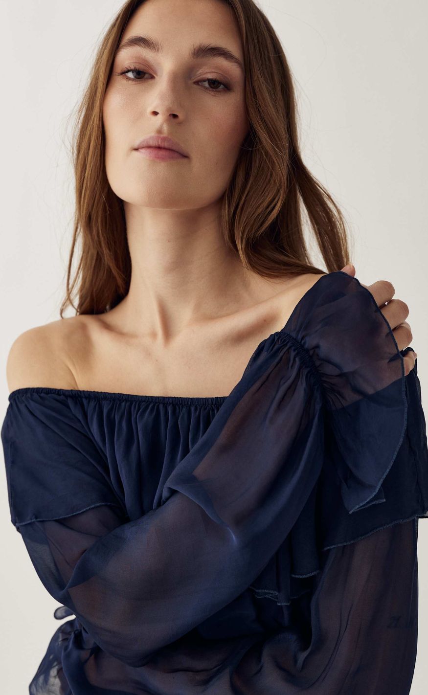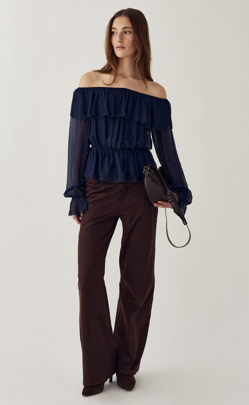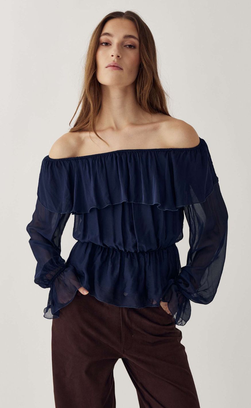 Feminin off-shoulder bluse i en let og transparent kvalitet med smukke flæsedetaljer, der giver et elegant og luftigt udtryk. Den elastiske halsudskæring og talje skaber en flatterende pasform, som gør blusen perfekt både til festlige anledninger og til et mere sofistikeret hverdagslook.