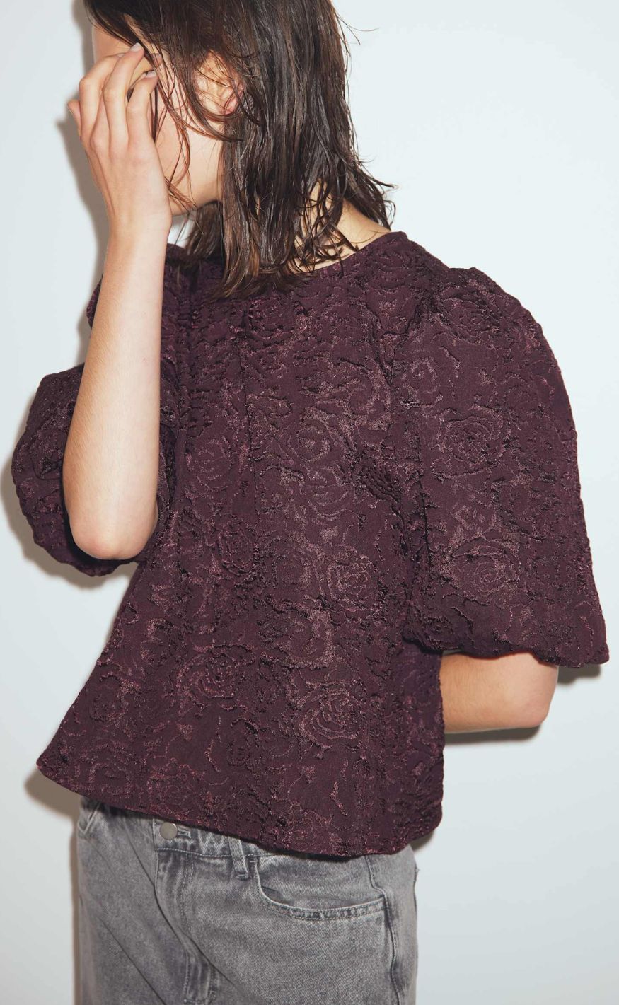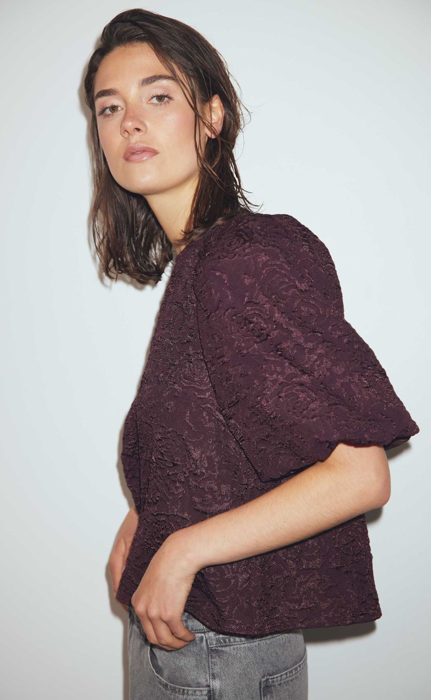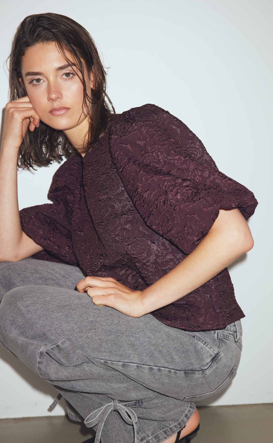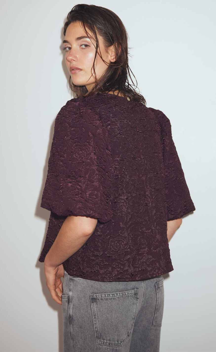 Smuk bluse i jacquardvævning med fine rosemotiver i skøn farve