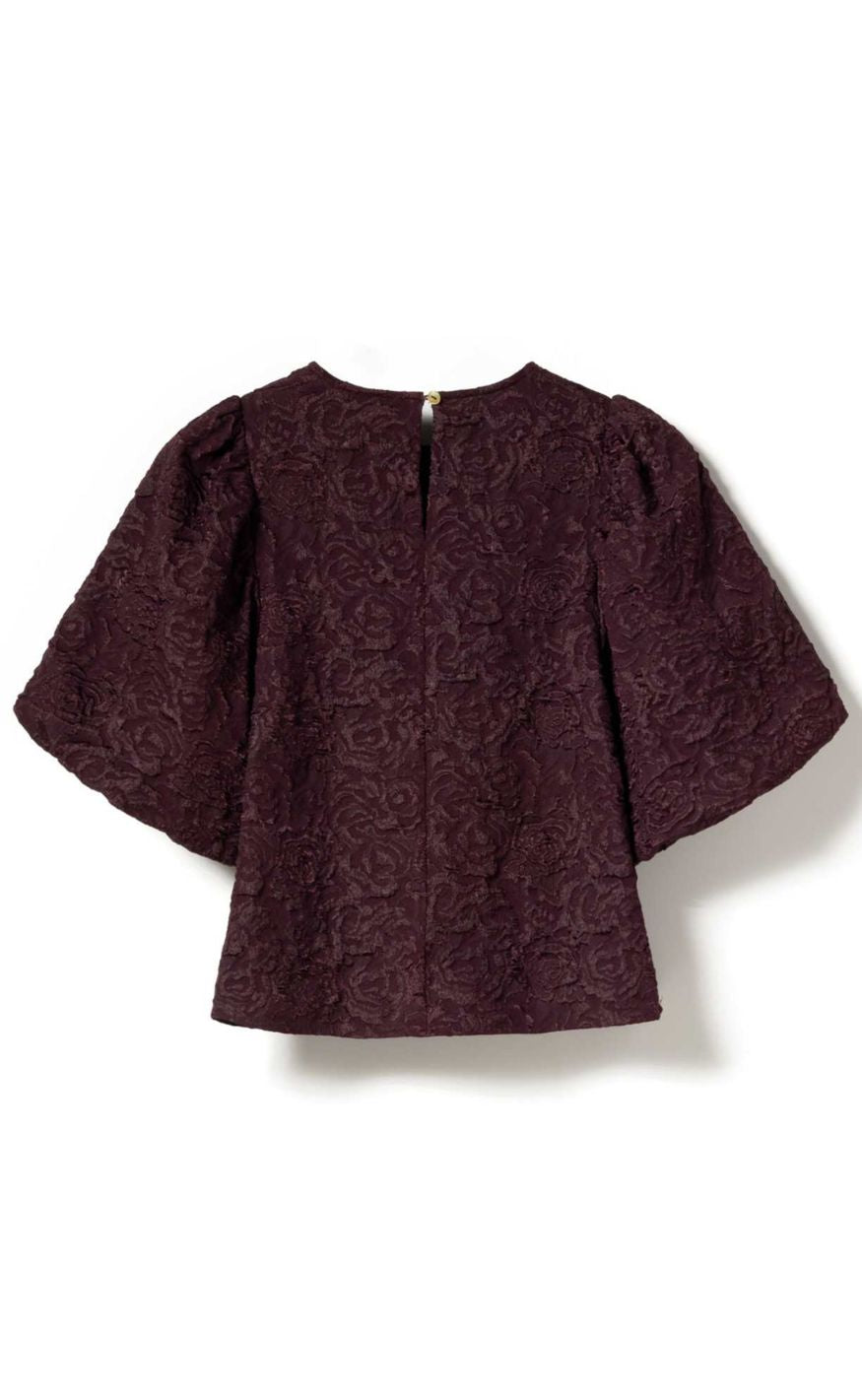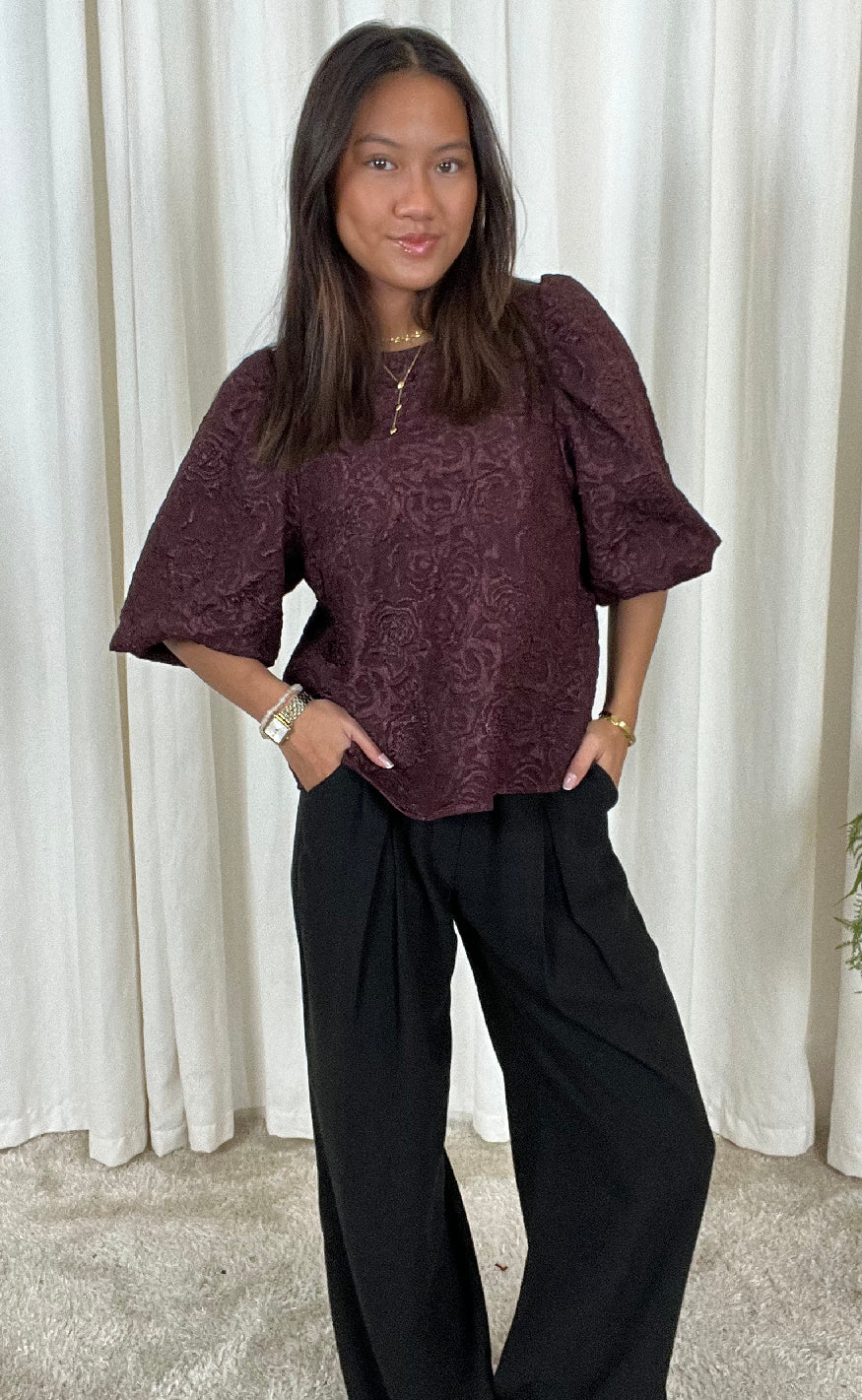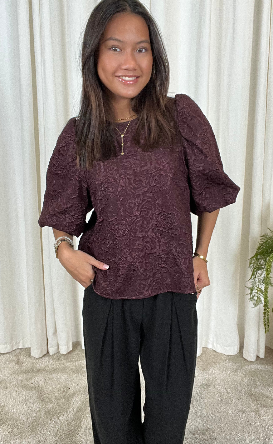 Smuk bluse i jacquardvævning med fine rosemotiver i skøn farve
