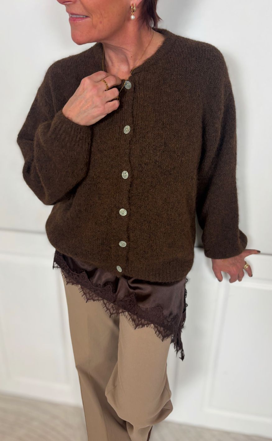 Klassisk og blød cardigan fra Noella i en varm, brun nuance.
