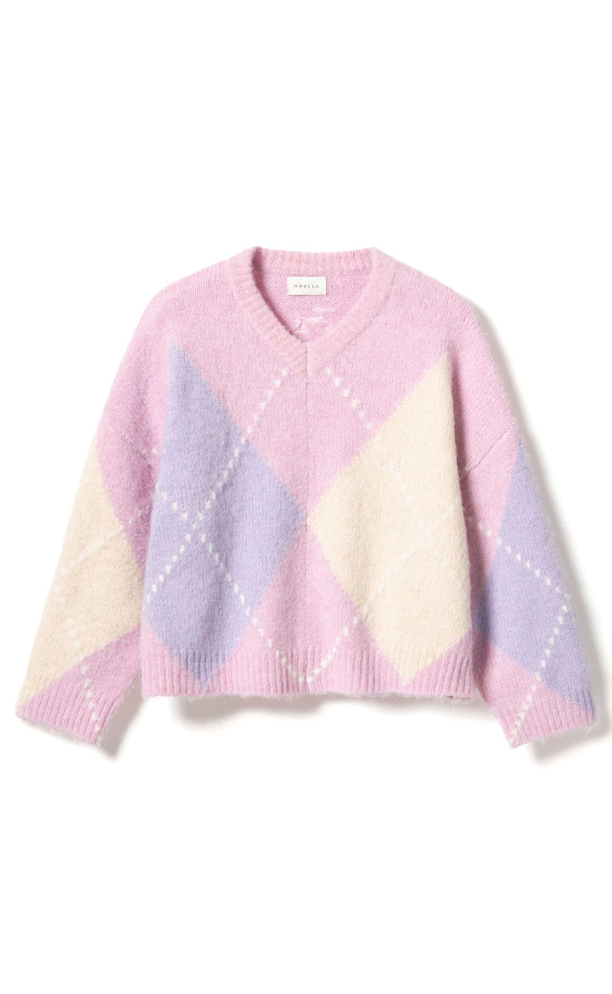 Blød og farverig strik fra Noella med et klassisk argyle-mønster i pastelnuancer af rosa, lilla og creme.